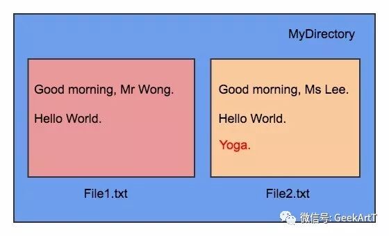 例如,假设我们在运行了git init命令的文件目录MyDirectory下有两个文件File1.txt和File2.txt。File1.txt和File2.txt这两个文件各包含两行文字,如下图。