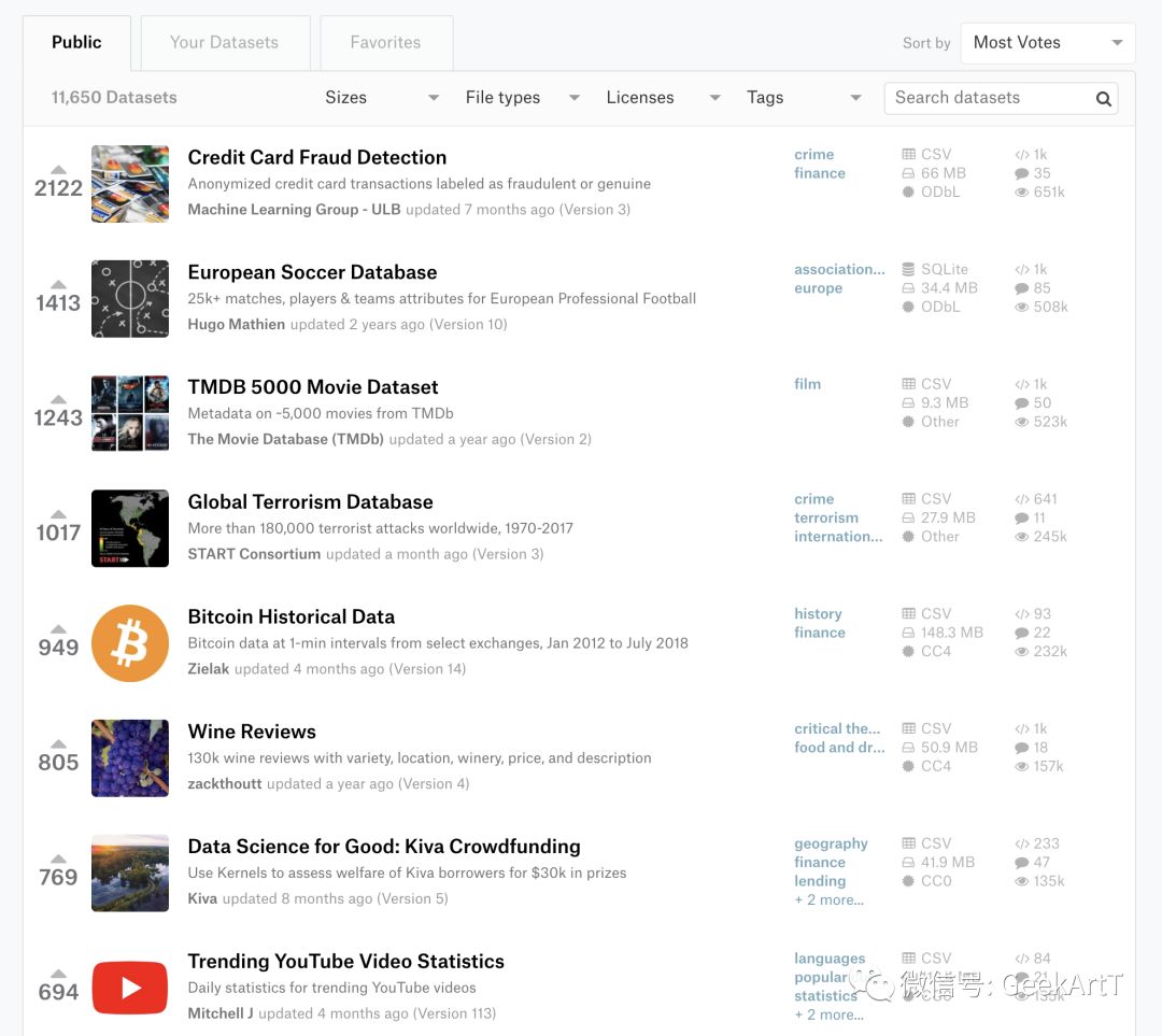 最热门的几个领域:金融、比特币、视频趋势、App趋势、医疗的数据都罗列在了这里。并且,Kaggle这个平台有的还不仅是数据源。就算你说数据我现在是有了,可我怎么分析呢?不用担心,每一份dataset都有相应的Kernel讨论区,里面充满了各种数据分析牛人的分析程序脚本,让你可以尽情地学习和借鉴。这难道不是把食物直接喂到你跟前,甚至是嚼碎了喂到你跟前么?