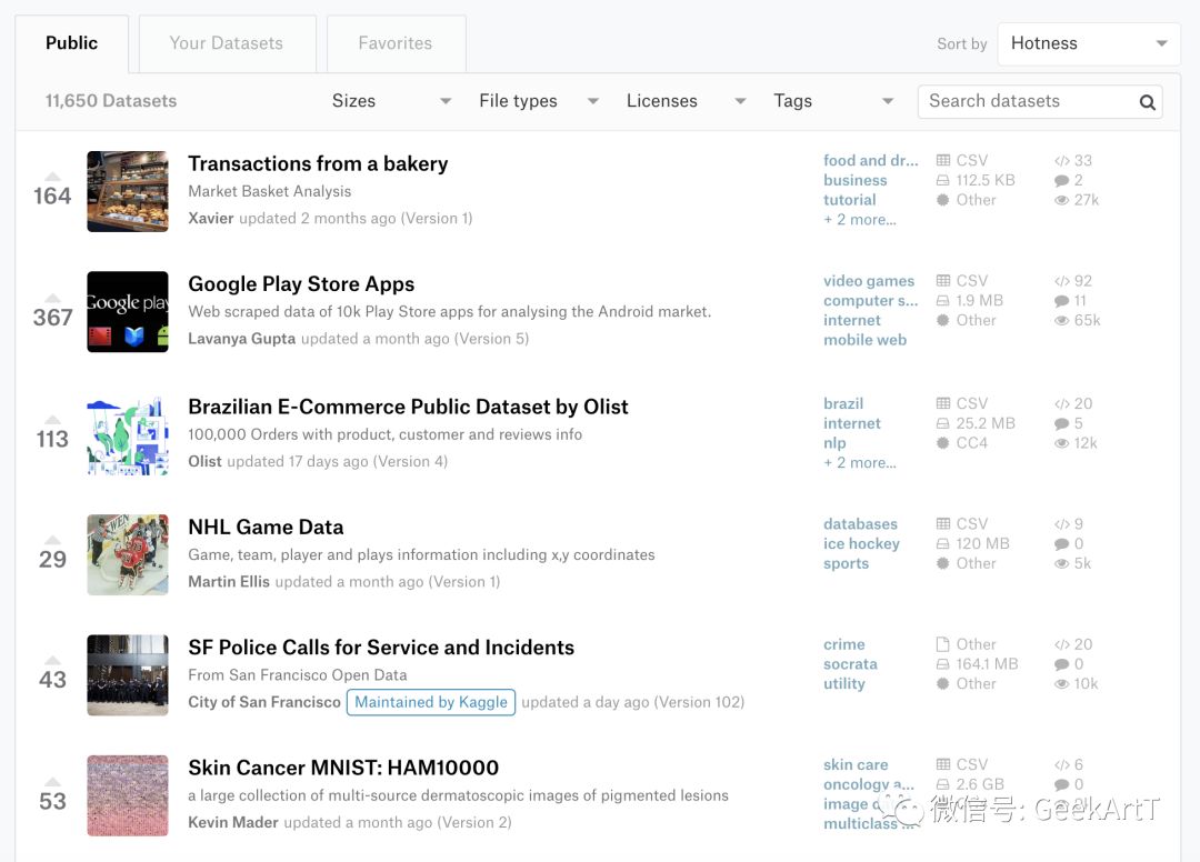 再比如,Kaggle的dataset这个项目已经建立了2年多了,但真正知道它、又用到它的人不知道有多少。让我们看看排在hotness前几位的是些什么项目: