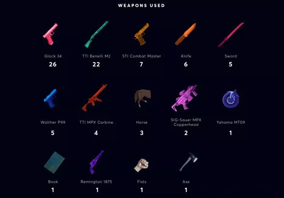 根据外媒 george_hatzis@visu 统计,第一部里,约翰开枪数122;第二部,开枪数302,到了第三部,开了307枪。
