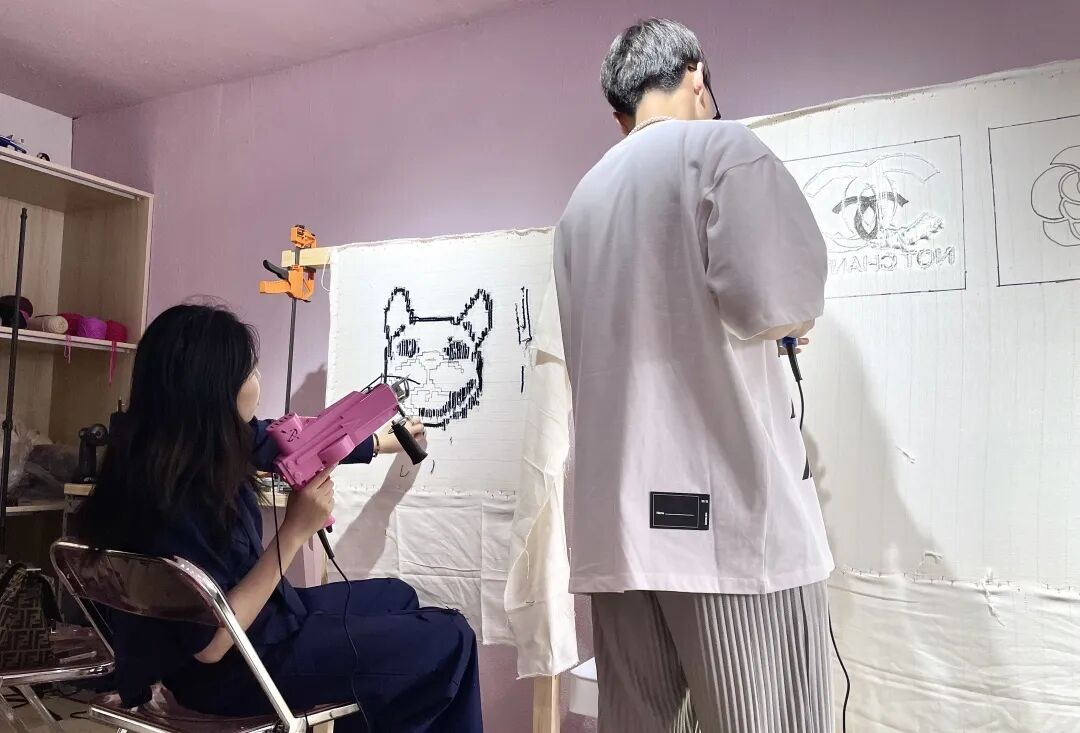 Tufting兴起迅速,快速占领年轻圈层的朋友圈,成品以绚丽的色彩和毛茸的手感俘获了众多猎奇青年。举起工具枪一针一针把色彩填满,在“突突突”的穿刺声中放空自我,最终享受一针一线为自己成就的满足感。
