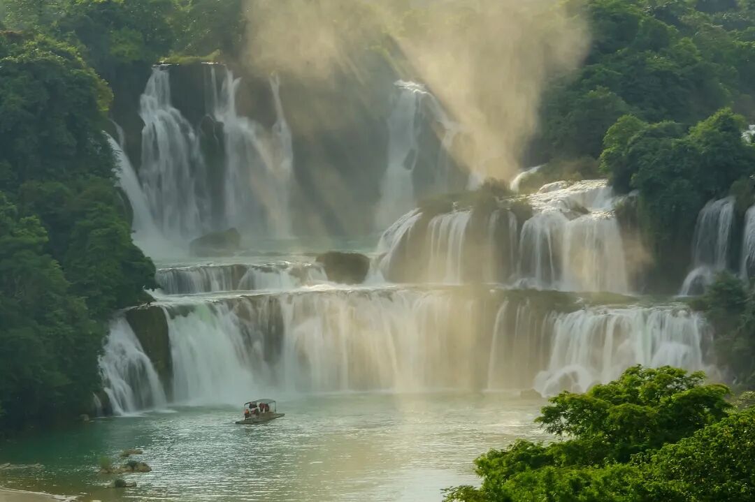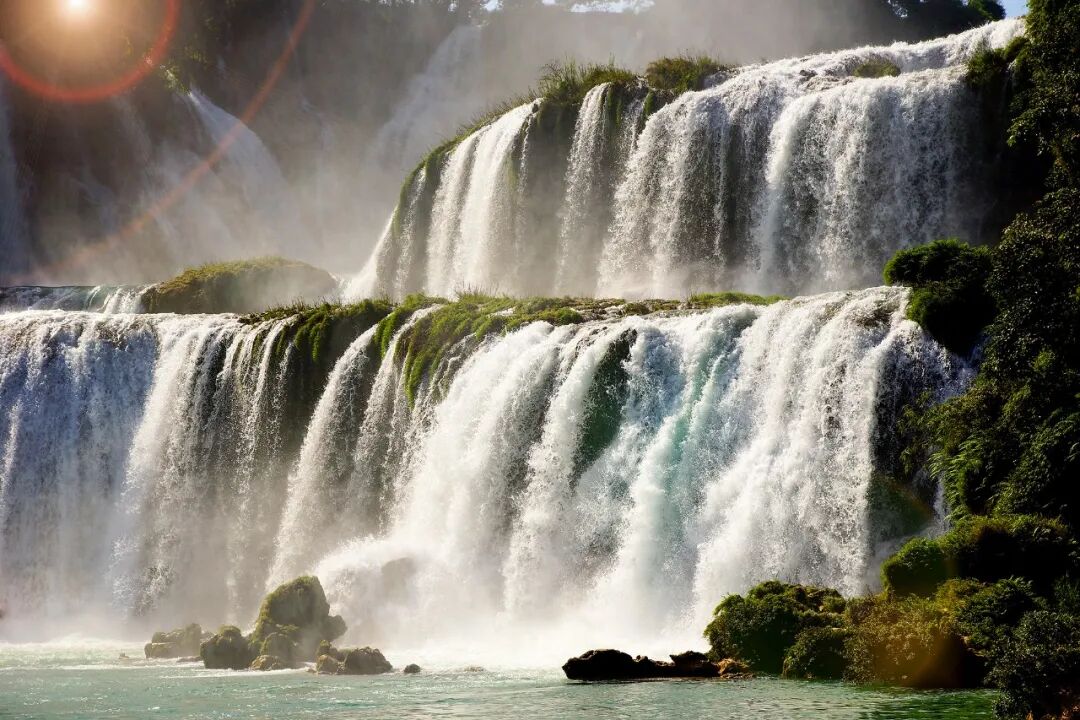 跨国寻仙·最美边境!德天跨国瀑布位于广西壮族自治区崇左市大新县硕龙镇德天村,是国家5A级旅游景区。瀑布横跨中、越两国,分为三级跌落,宽200多米,纵深60多米,落差达70米,层层跌落,水势激荡,气势磅礴,是亚洲第一大跨国、中国最美的瀑布。