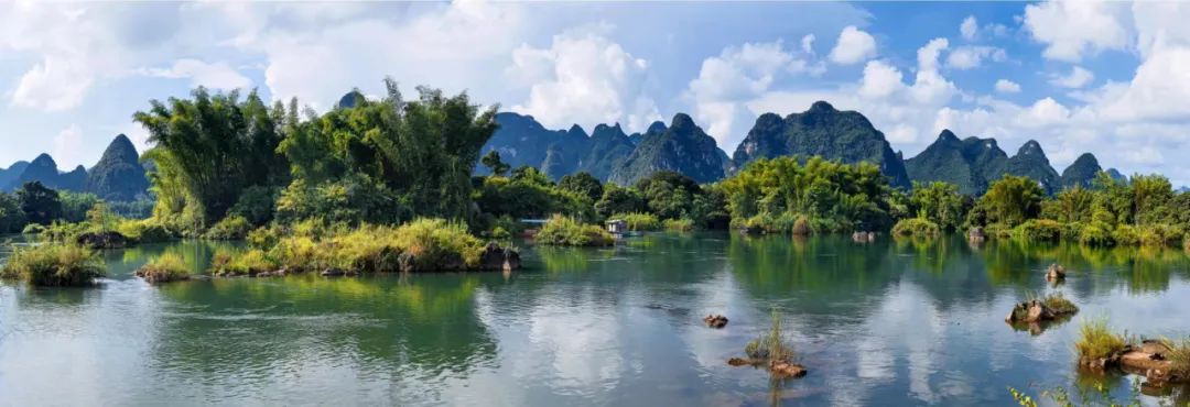 清澈的河水平缓地在船下流动,倒影着两岸的绿树,远处的青山、蓝天白云,构成“山水共长天一色”的自然景观。