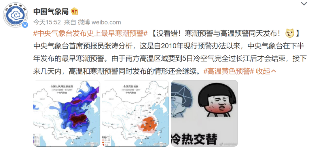 10月2日,我国南方大部地区在强悍的副热带高压掌控下,多地热如盛夏;北方则受强冷空气影响,将迎来剧烈降温,中央气象台当天10时发布了自2010年正式启用预警发布机制以来最早的寒潮预警,并且这也是史上首次出现高温、寒潮两个预警同时发布的情况。