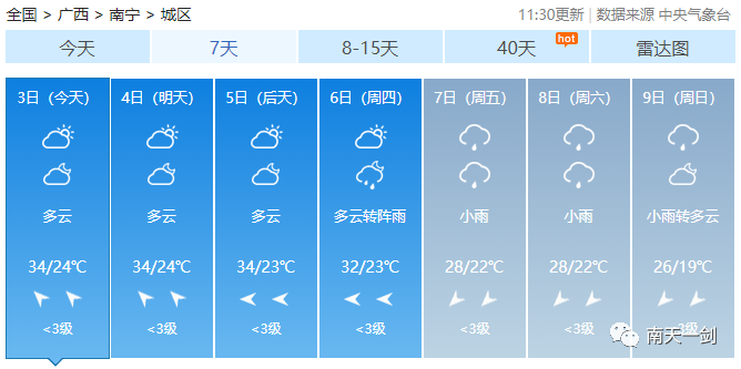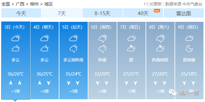 预计10月3日白天,河南南部、安徽、江苏大部、上海西部、湖北大部、湖南、江西、浙江大部、福建、重庆南部、贵州东北部、广西东北部、广东中北部等地有35~36℃高温天气,其中,河南南部、安徽、江苏西南部、湖北中东部、湖南中东部、江西、浙江、福建中西部、广东东北部等地部分地区最高气温37~39℃,江西北部、福建西北部局地可达40℃以上。