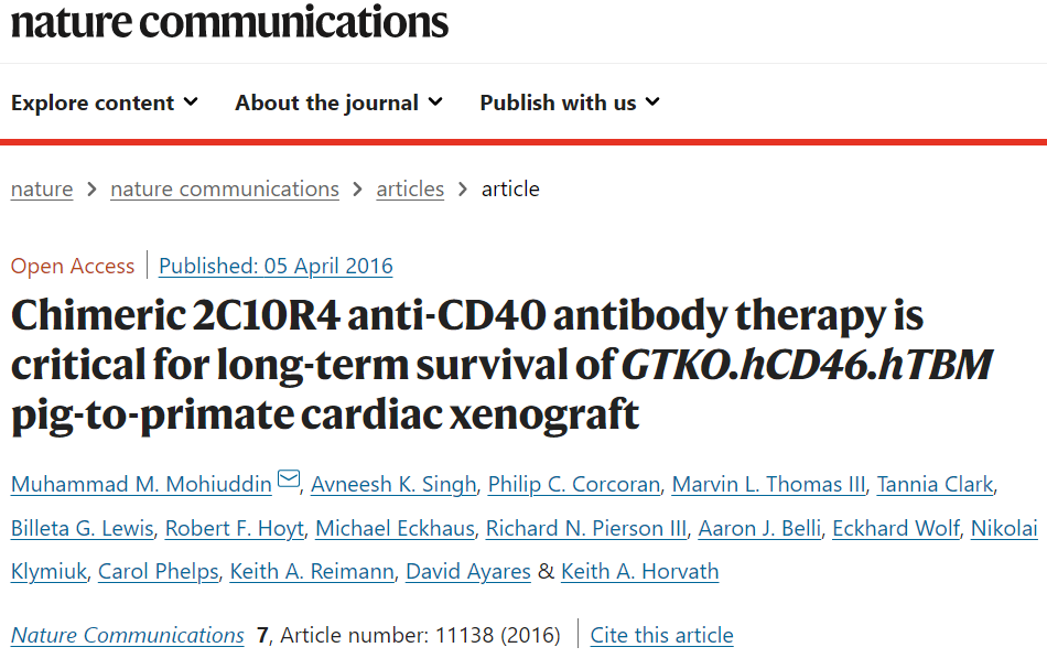 [4] Mohiuddin, M., Singh, A., Corcoran, P. et al. Chimeric 2C10R4 anti-CD40 antibody therapy is critical for long-term survival of GTKO.hCD46.hTBM pig-to-primate cardiac xenograft. Nat Commun (2016). https://doi.org/10.1038/ncomms11138