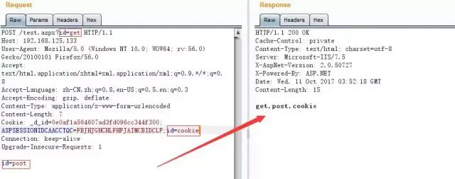 在ASPX中,有一个比较特殊的HPP特性,当GET/POST/COOKIE同时提交的参数id,服务端接收参数id的顺序GET,POST,COOKIE,中间通过逗号链接,于是就有了这个idea。