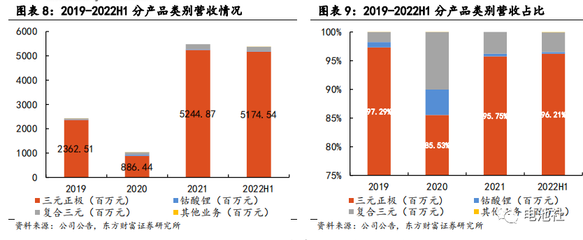 镍钴锰三元正极营收占比90%以上,是公司的核心业绩来源。2019-2022H1,公司三元正极营业收入分别实现 23.63/8.86/52.45/51.75 亿元,除 2020 年受新冠疫情影响,产线停工、订单推迟导致收入下滑外,其余年份三元正极的收入占比均在 95%以上,是公司的核心支柱业务。除三元正极业务外,公司还有钴酸锂、复合三元材料及其他业务,营收占比较小。