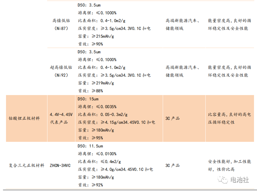 产品覆盖全面,涵盖三元正极材料、钴酸锂、复合三元正极材料等。新能源汽车领域正极材料是公司的核心竞争产品,涵盖包括中镍、中高镍及高镍在内的多种型号一次颗粒大单晶镍钴锰酸锂三元正极材料(NCM);消费电子用正极材料,主要包括高电压钴酸锂、复合三元正极材料以及一次颗粒大单晶三元正极材料。