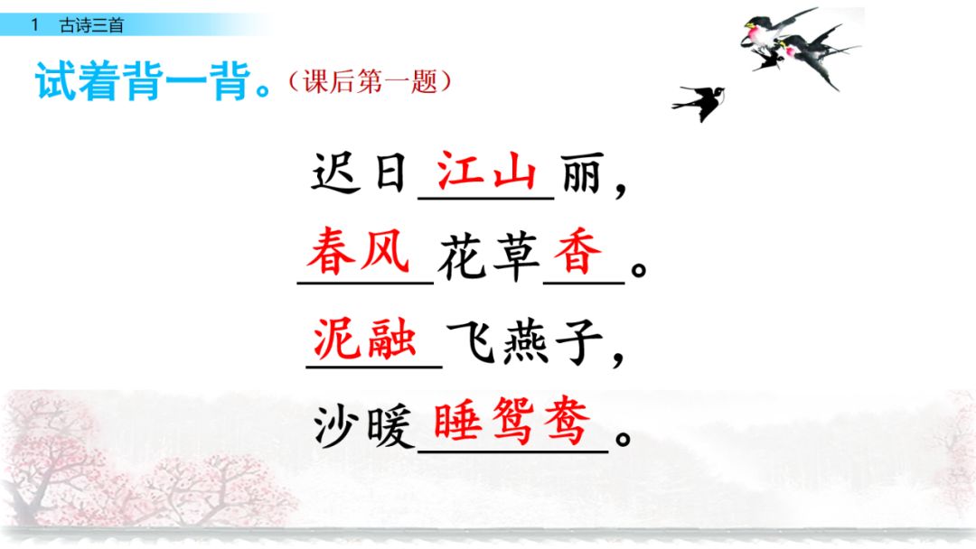 1. 背诵《古诗三首》《燕子》(第1-3 自然段) 《荷花》(第2-4 自然段)《忆江南》