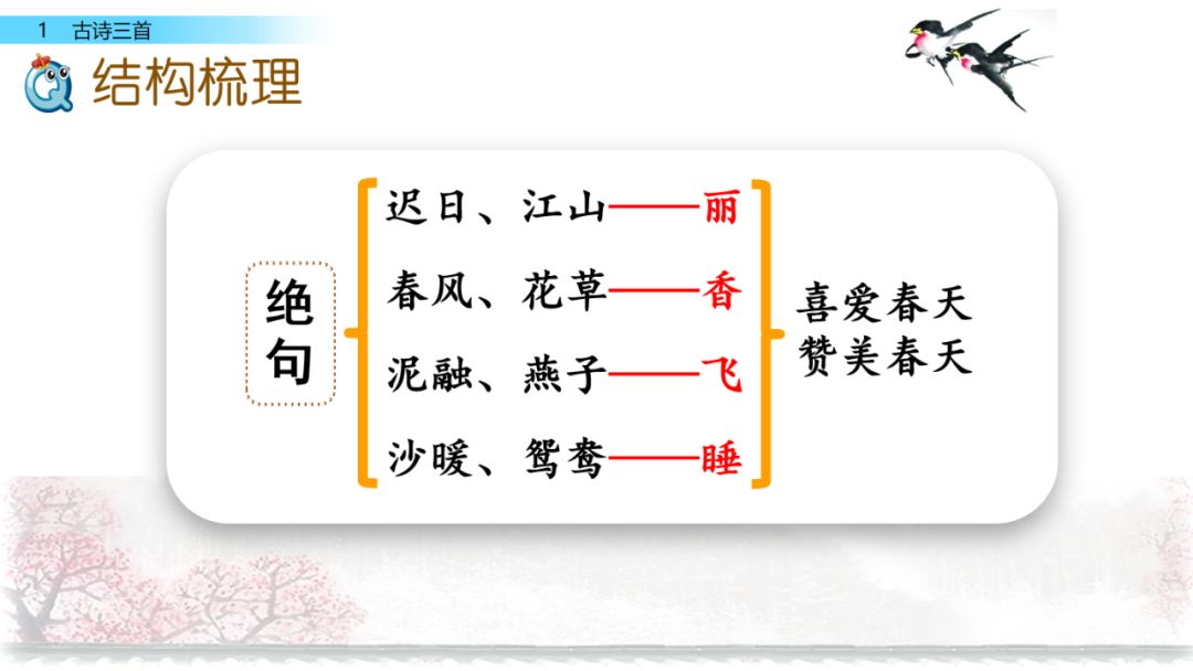 《绝句》春天来了,在明媚的阳光映照下,山河无比秀丽。春风中飘散着各种花草的芳香。溪边的泥土融化了,小燕子翩翩地飞来飞去,衔着湿泥筑巢,春光映照下成对的鸳鸯睡卧在沙滩上,享受着春天的温暖。