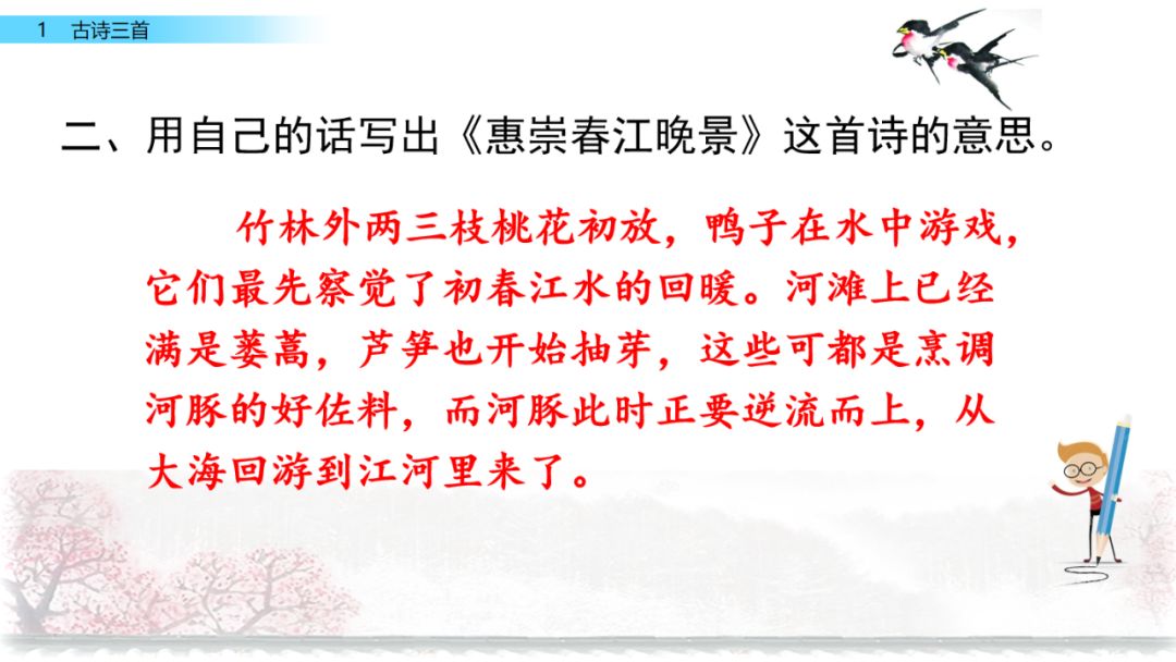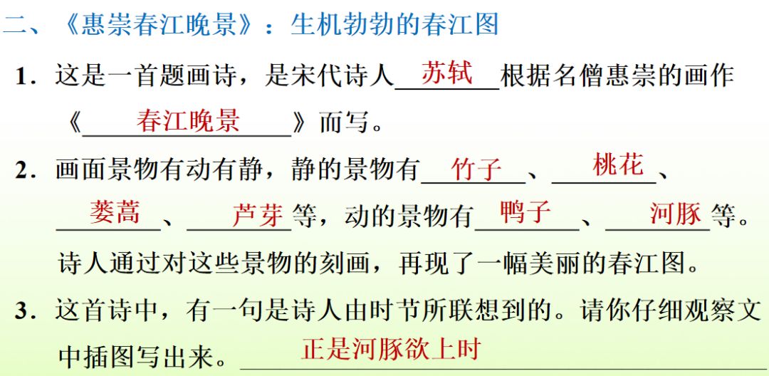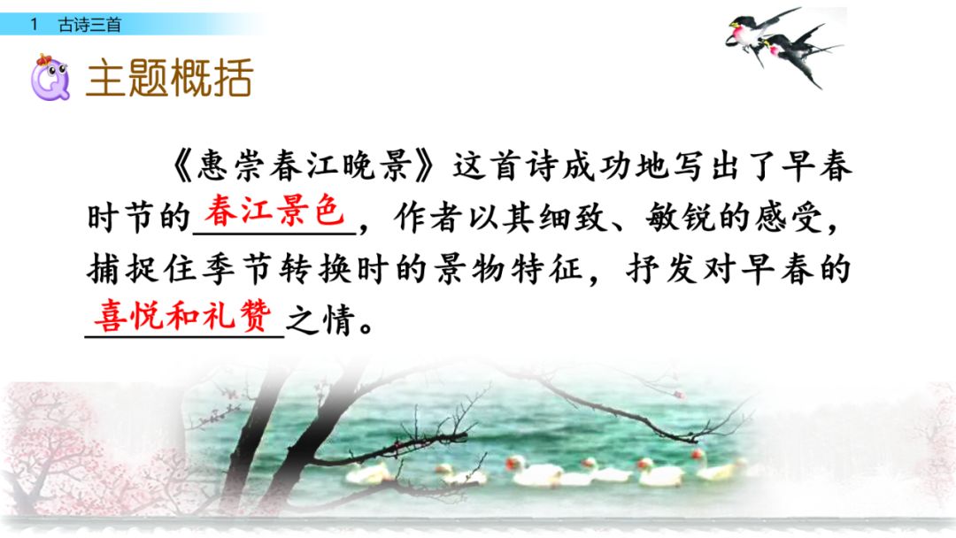 《惠崇春江晚景》是一首题图诗,向我们展示了一幅活生生的江南水乡春景图。字里行间流露出诗人对春天的喜爱和赞美之情。