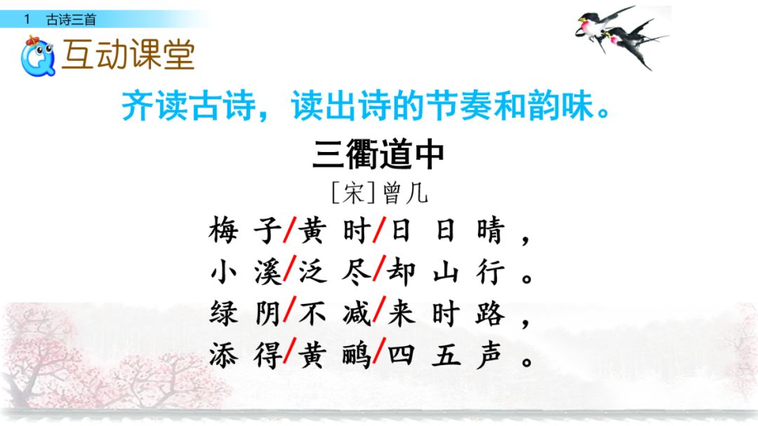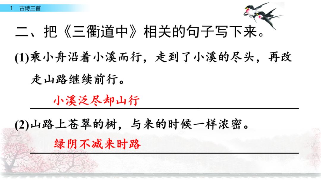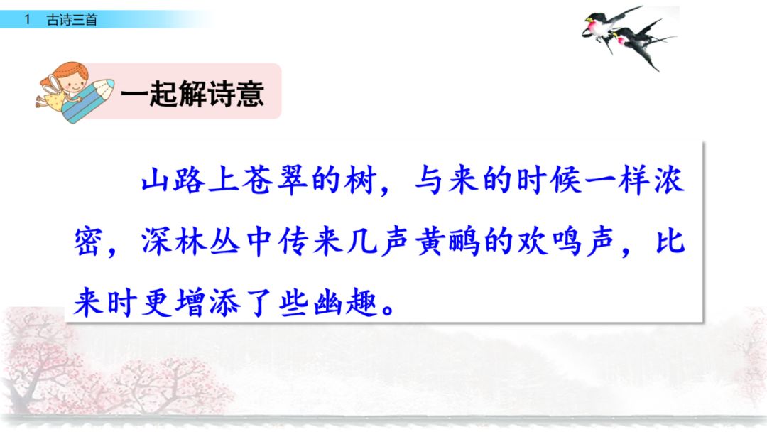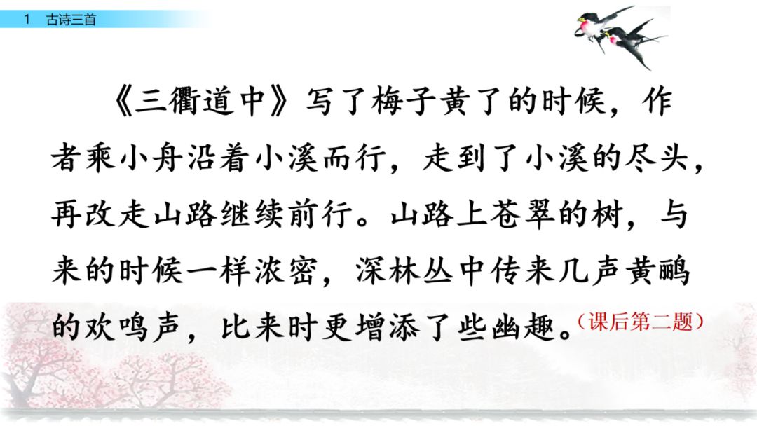 《三衢道中》梅子黄透了的时候,本来应该是阴雨连绵,却天天都是晴和的好天气,诗人乘小舟沿着小溪而行,走到了小溪的尽头,再改走山路继续前行。山路上苍翠的树,与来的时候一样浓密,深林丛中传来几声黄鹂的欢鸣声,比来时更增添了些幽趣。