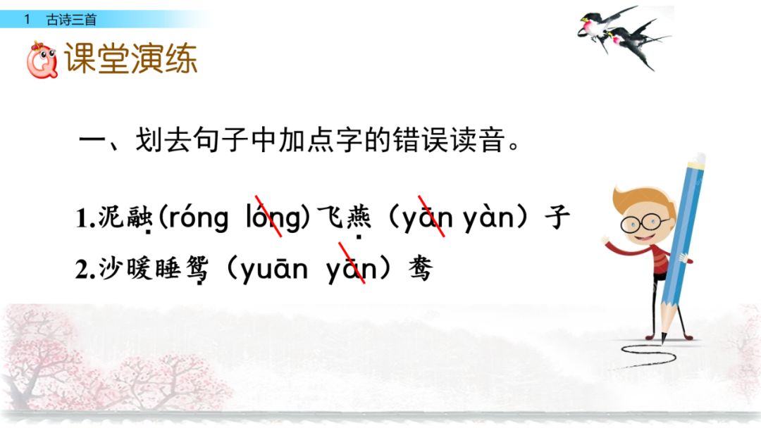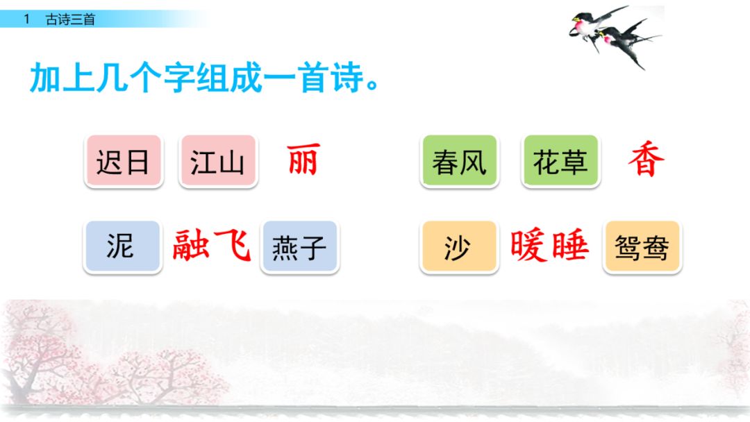 诗意:春天来了,在明媚的阳光映照下,山河无比秀丽。春风中飘散着花草的芳香。溪边泥土湿软,小燕子翩翩地飞来飞去,衔泥筑巢。暖和的沙子上睡着成双成对的鸳鸯。