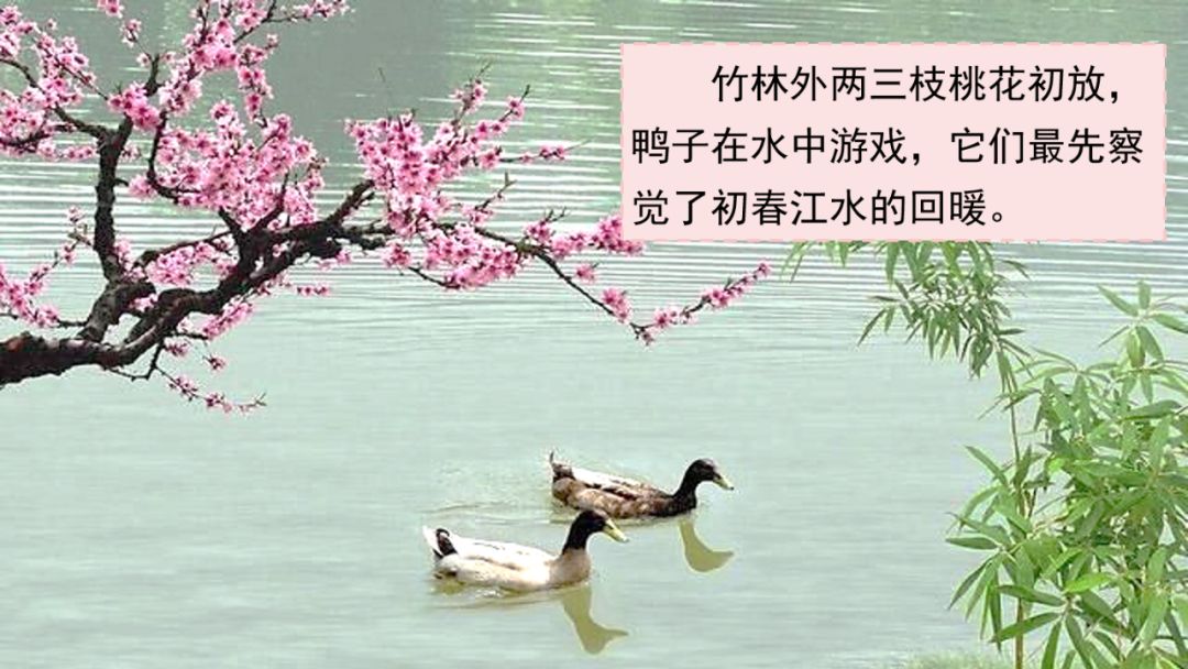 诗意:竹林外两三枝桃花初放,鸭子在水中游戏,它们最先察觉了初春江水回暖。河滩上已经长满了蒌蒿,芦笋也开始抽芽了,而这恰是河豚从大海回归,将要逆江而上产卵的季节。