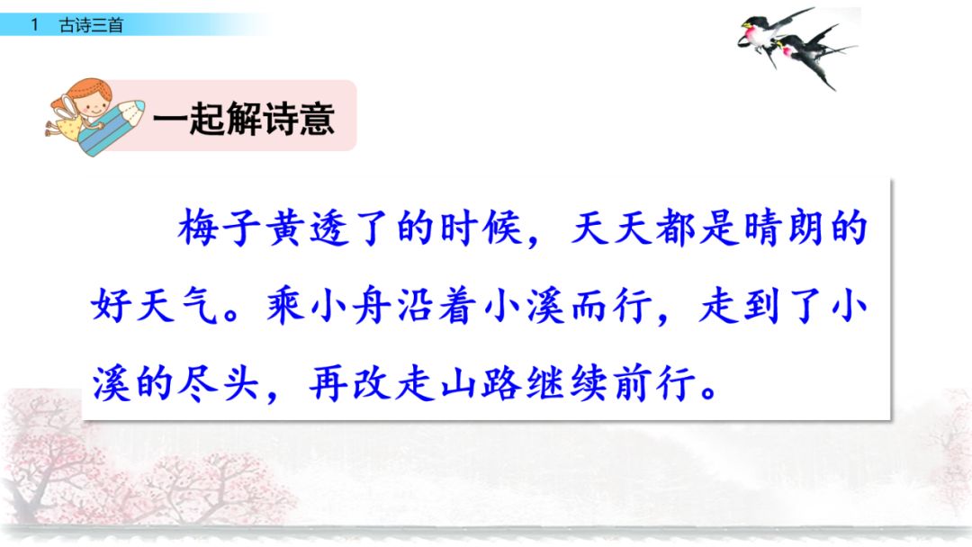 诗意:梅子黄透了的时候,天天都是晴和的好天气,(我)乘小船到小溪的尽头,再改走山路继续前行。山路上苍翠的树投下的树荫,与来的时候一样浓密,深林中传来几声黄鹂的欢鸣声,比来时更增添了些许幽趣。
