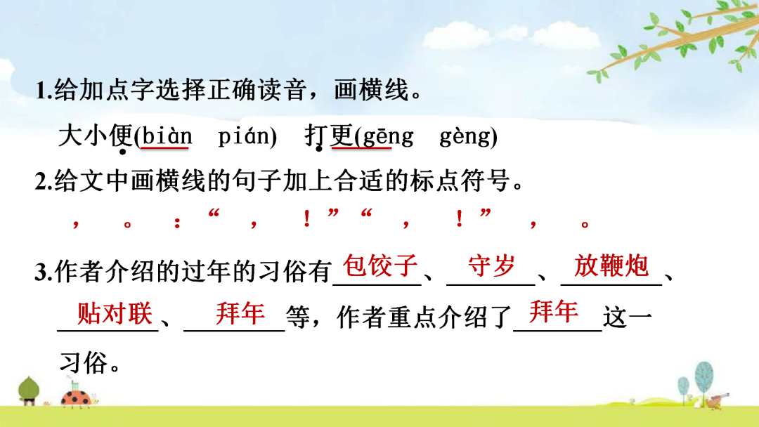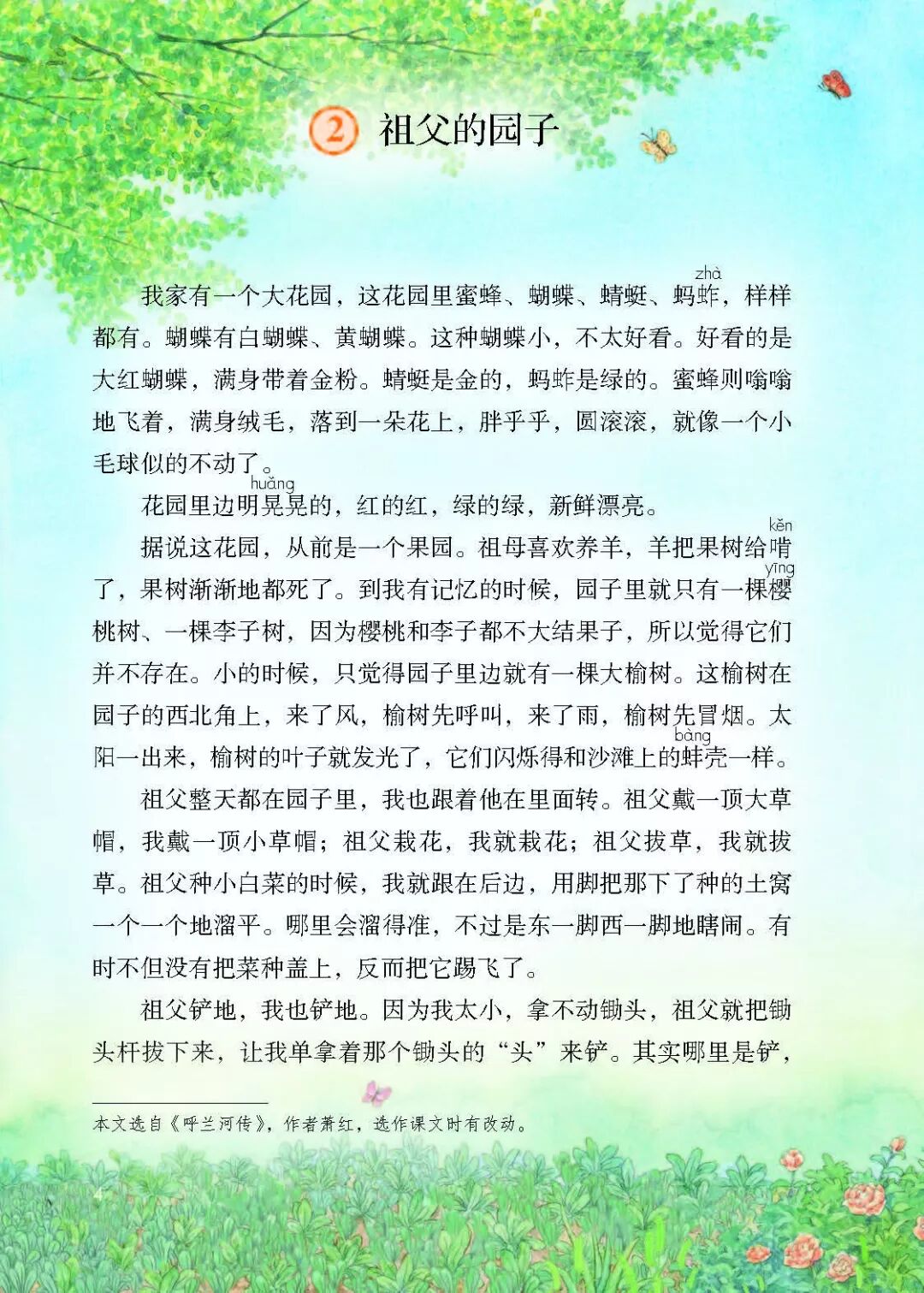 (1)祖父的园子是一个五彩缤纷、生机勃勃的园子。园子里有蜜蜂、蝴蝶、蜻蜓、蚂蚱等许多可爱的昆虫,白、黃、红、金、绿,各种颜色一应俱全。