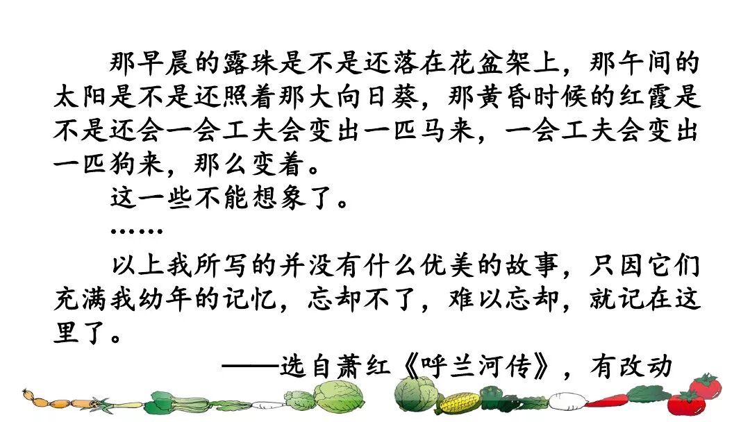 (2) 祖父的园子是一个自由自在、充满欢声笑语的地方。花是自由的,鸟是自由的,虫子是自由的,菜是自由的,什么都是自由的,空气里弥漫着自由。童年的作者也是自由的,这自由是她童年快乐的源泉。