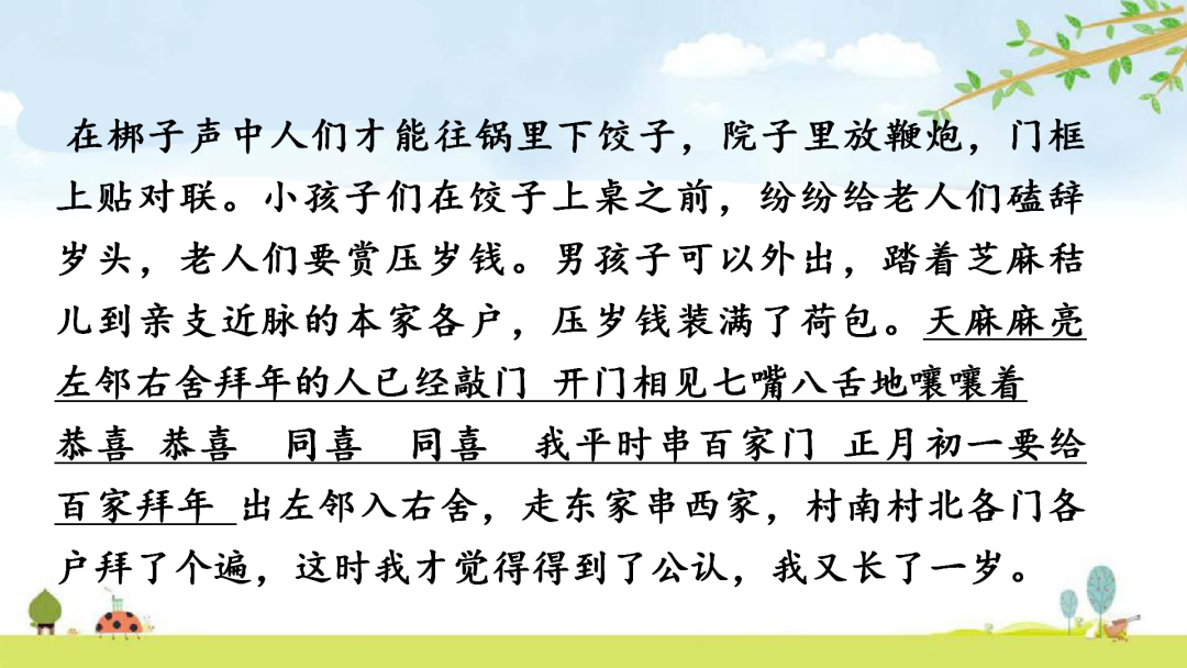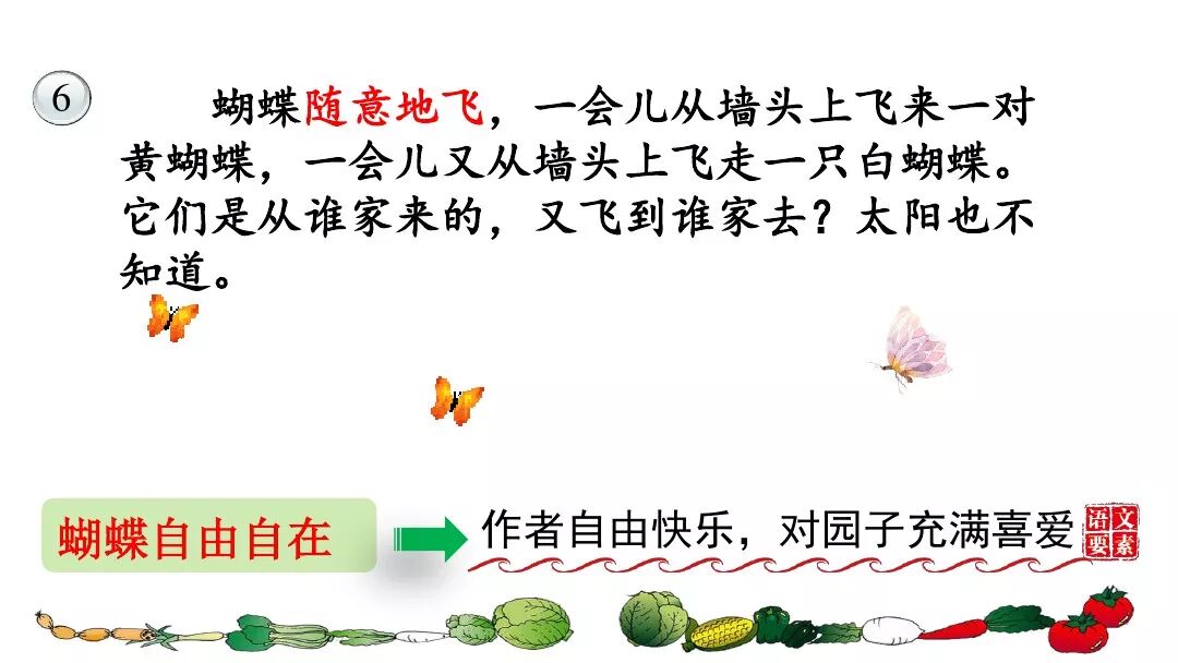 这一段中反复出现的是“愿意”“就”这两个词。作者反复运用这些词语,表面上写倭瓜上架上房、黄瓜开花结果、玉米生长和蝴蝶飞舞得自由自在,无拘无束,其实是作者把自己的自由快乐、无拘无束的心情寄托在这些事物上面,通过拟人化的描写表现自己自由快乐的童年生活,借景抒情,清新自然。