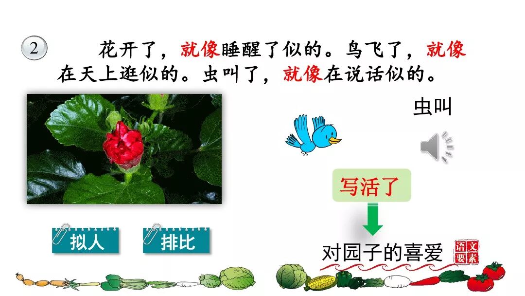 运用拟人、排比修辞,写出园子里的花、鸟、虫是自由快乐的,是无拘无束的。