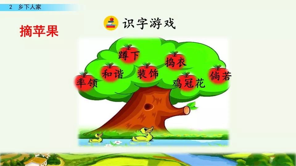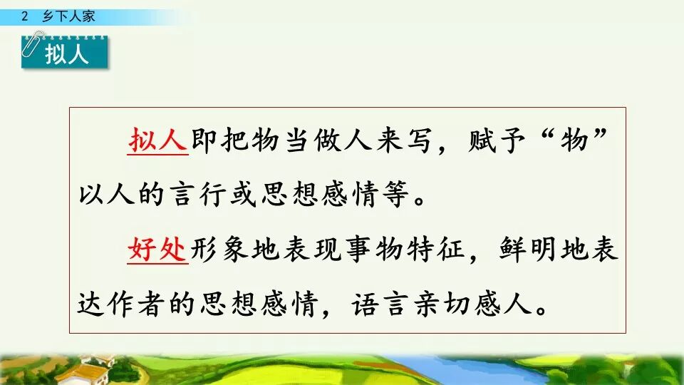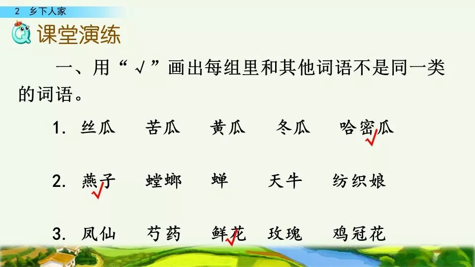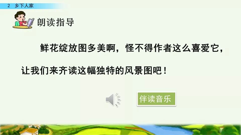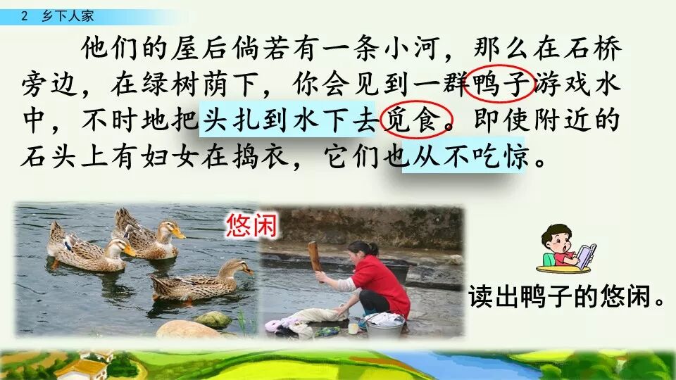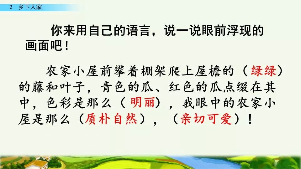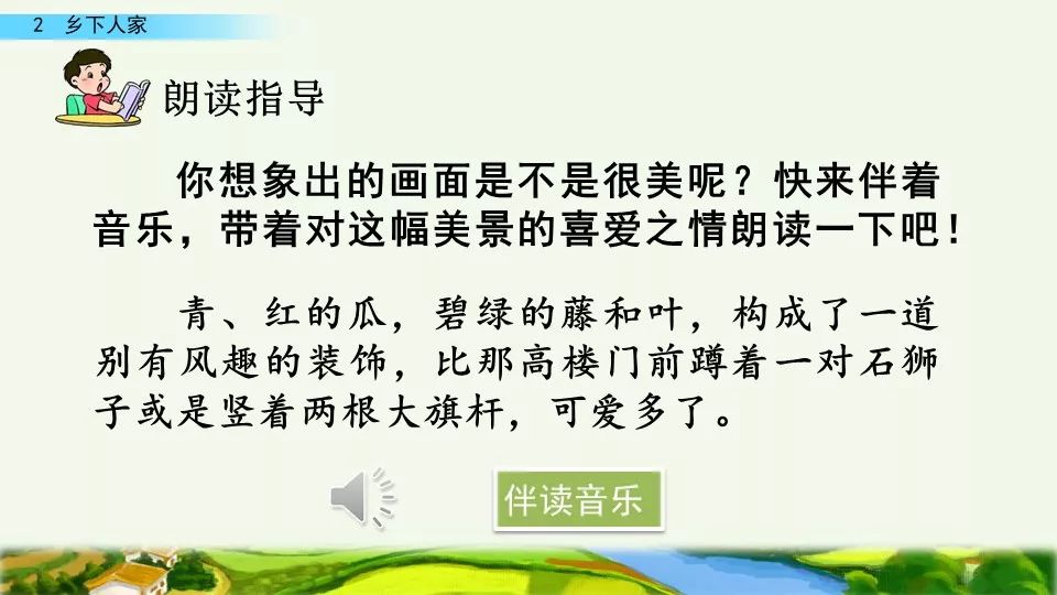 装饰:本课指乡下人家房前的青、红的瓜,碧绿的藤和叶。