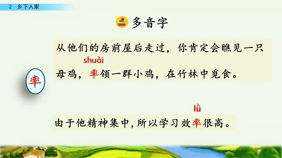 率领:带领(队伍或集体)。本课指母鸡带领小鸡。