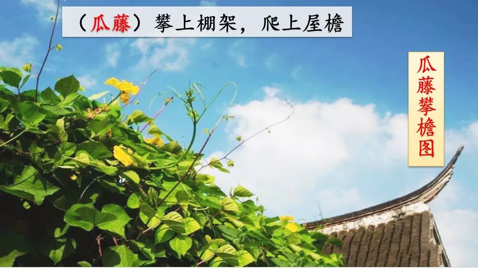 开头寥寥数语描绘了瓜藤攀架爬檐的场景,展示了乡村自然质朴、恬静祥和的农家风光。