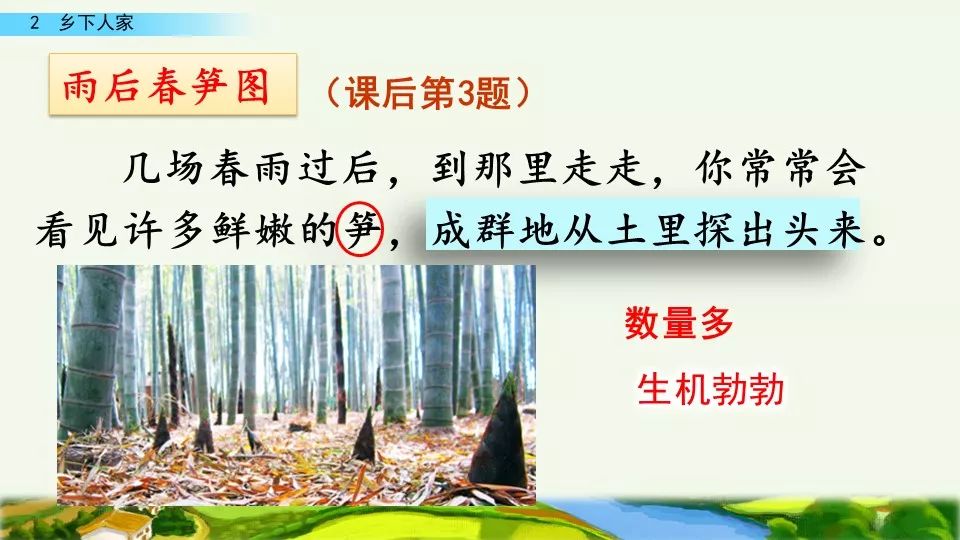 2.几场春雨过后,到那里走走,常常会看见许多鲜嫩的笋,成群地从土里探出头来。