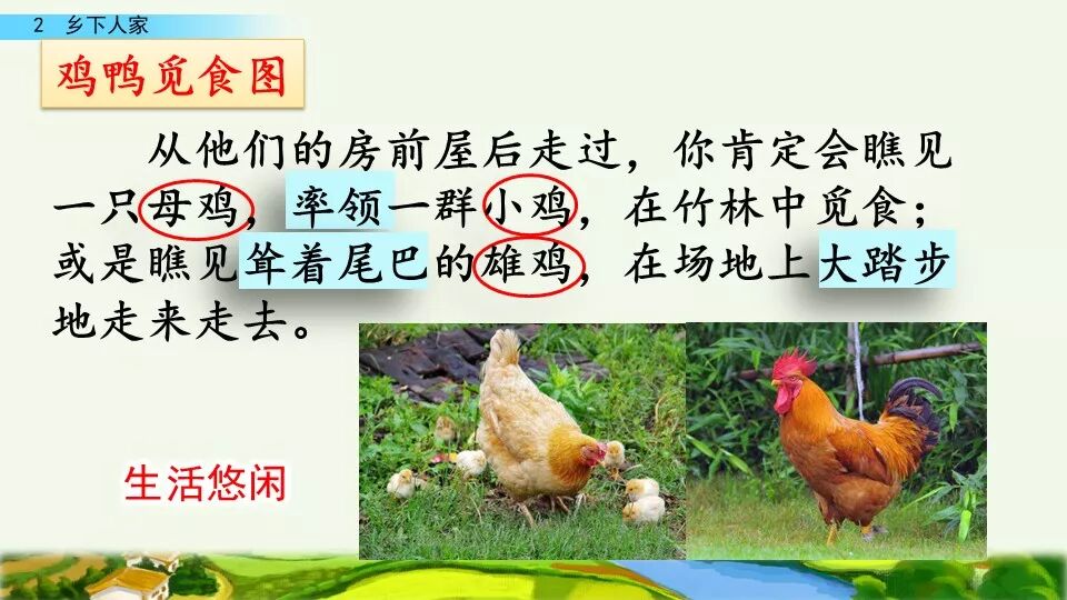 5.鸡,乡下人家照例总要养几只的。从他们的房前屋后走过,肯定会瞧见一只母鸡,率领一群小鸡,在竹林中觅食;或是瞧见耸着尾巴的雄鸡,在场地上大踏步地走来走去。