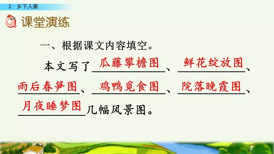 课文先后描写了乡下人家六个生活场景,概括起来分别是“瓜藤攀架图”“鲜花绽放图”“雨后春笋图”“鸡鸭觅食图”“院落晚餐图”“秋夜睡梦图”。