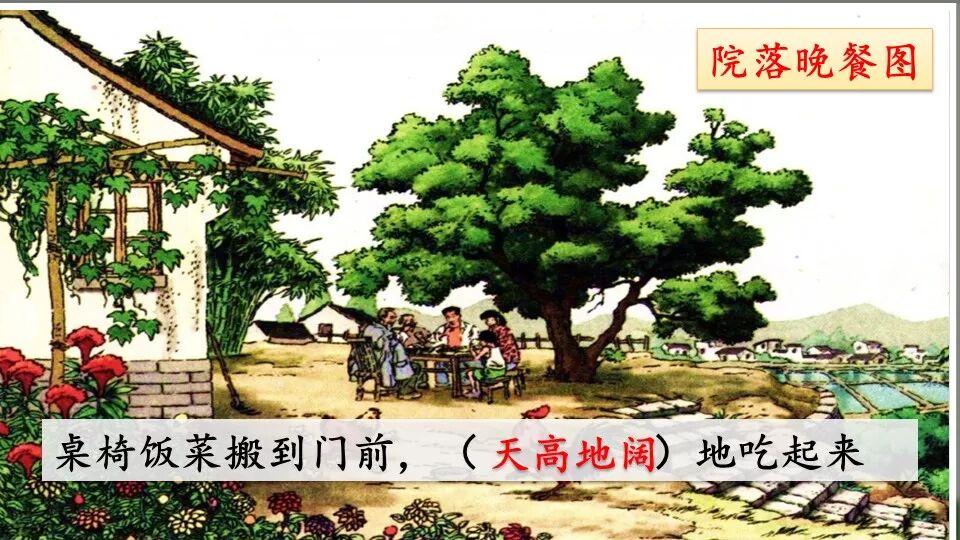 4.若是在夏天的傍晚出去散步,常常会瞧见乡下人家吃晚饭的情景。他们把桌椅饭菜搬到门前,天高地阔地吃起来。把“天高地阔”换成“津津有味”或“狼吞虎咽”好不好,为什么?