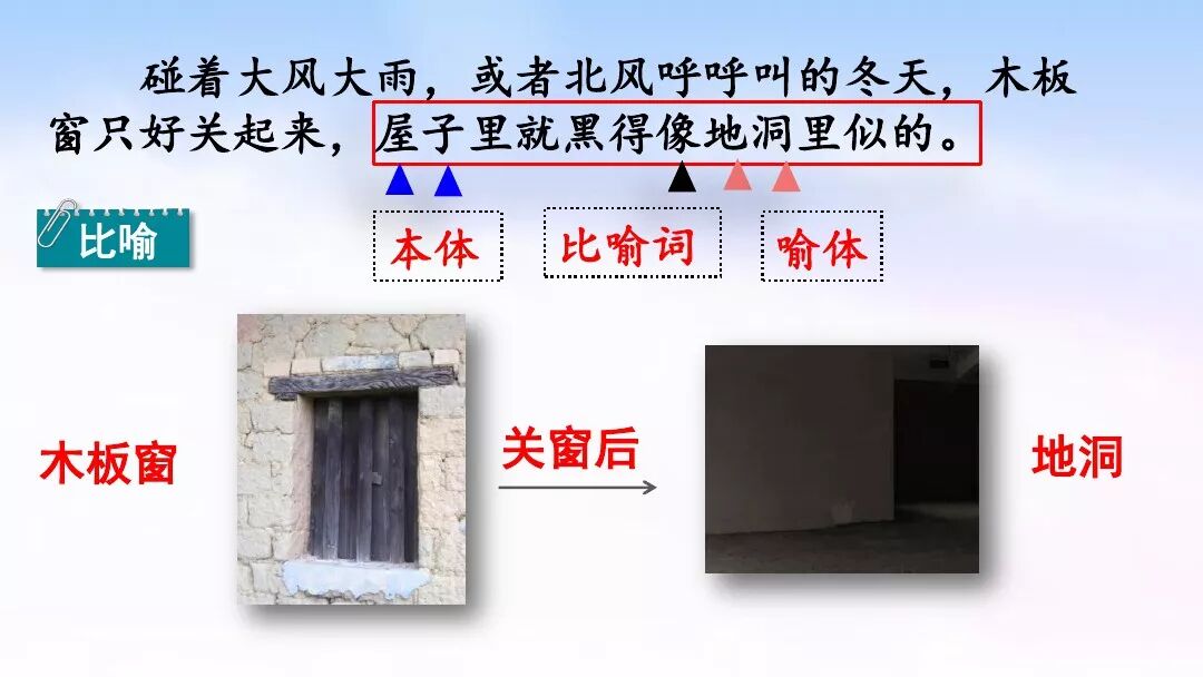 1.碰着大风大雨,或者北风呼呼叫的冬天,木板窗只好关起来,屋子里就黑得像地洞里似的。