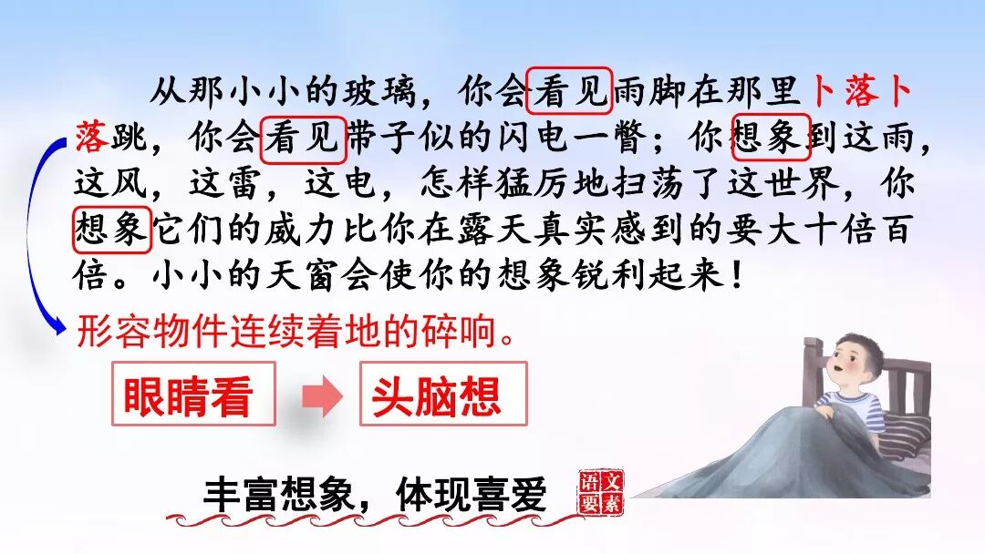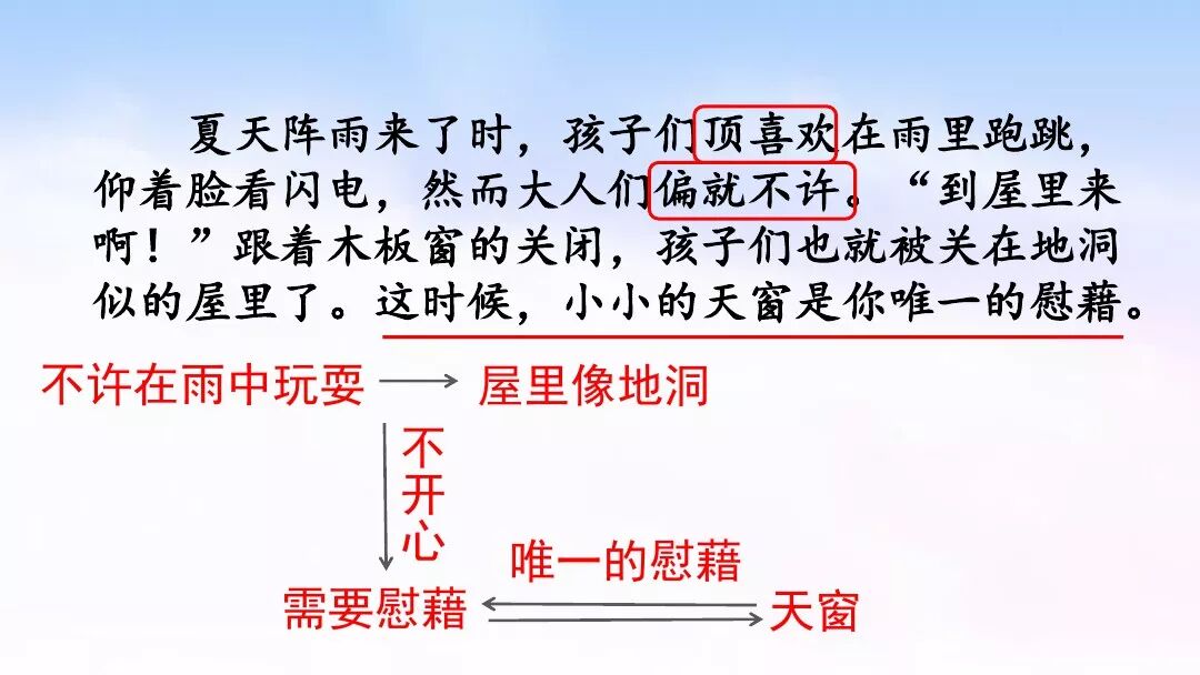这句话紧承上文,与第4自然段“唯一的慰藉”相照应,再次强调了雨天里,天窗对孩子们心灵起到的抚慰作用。