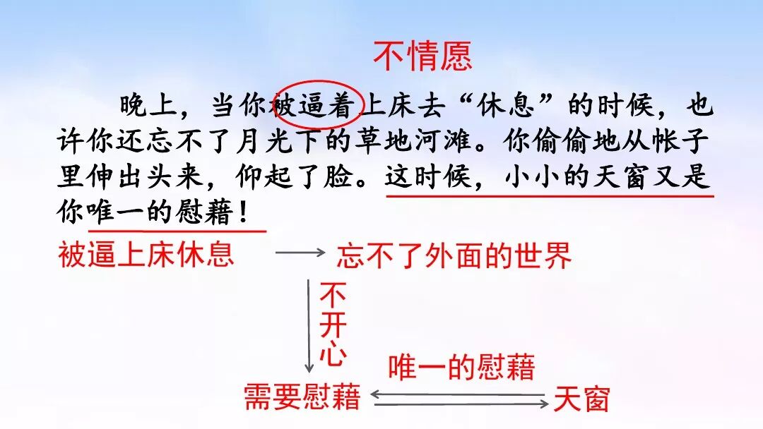 4.你偷偷地从帐子里伸出头来,你仰起了脸。这时候,小小的天窗又是你唯一的慰藉!文中再次出现“唯一的慰藉”这句话,有什么作用?