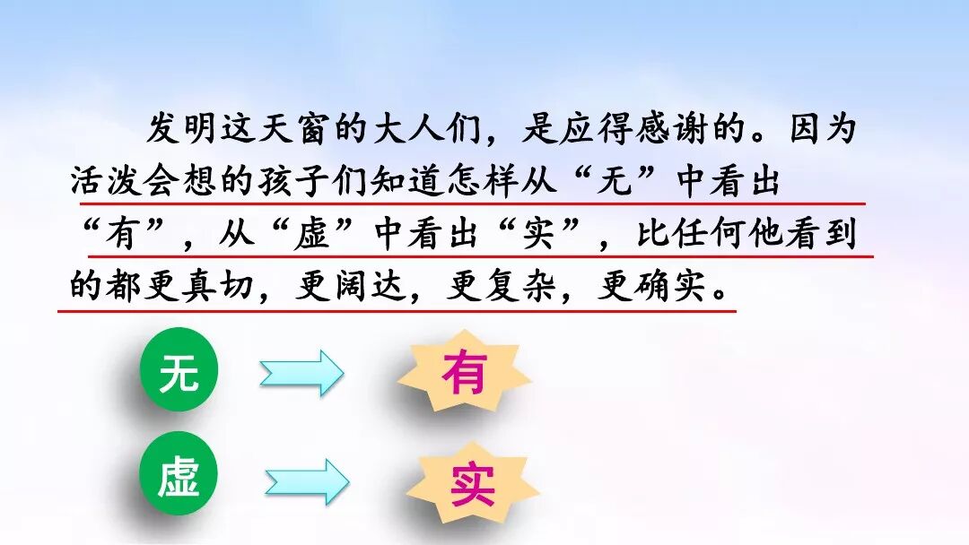 这里的“无”和“虚”指透过天窗仅能看见和听见的屋外世界,“有”和“实”指想象的情景。孩子们在下雨时透过天窗看见闪电,听到风声、雨声、雷声,可以想象风丽雷电的情景;透过天窗看见一颗星、一片云,可以想象满天繁星云彩的情景。