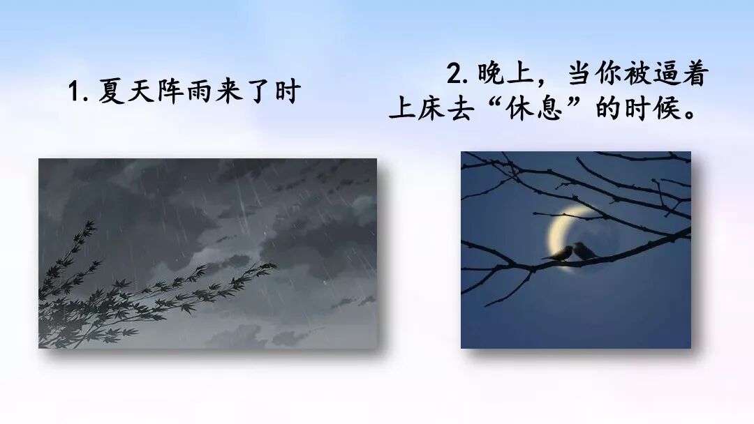 2.夏天阵雨来了时,孩子们顶喜欢在雨里跑跳,仰着脸看闪电,然而大人们偏就不许。“到屋里来啊!”