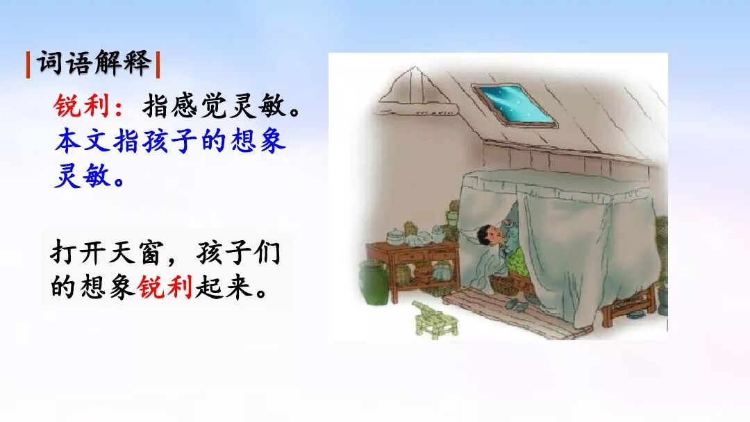 用“也许”这个带有想象色彩的词语组成的排比句,想象夜晚的美丽与神奇,极富感染力,体现了天窗给孩子们带来的快乐 。