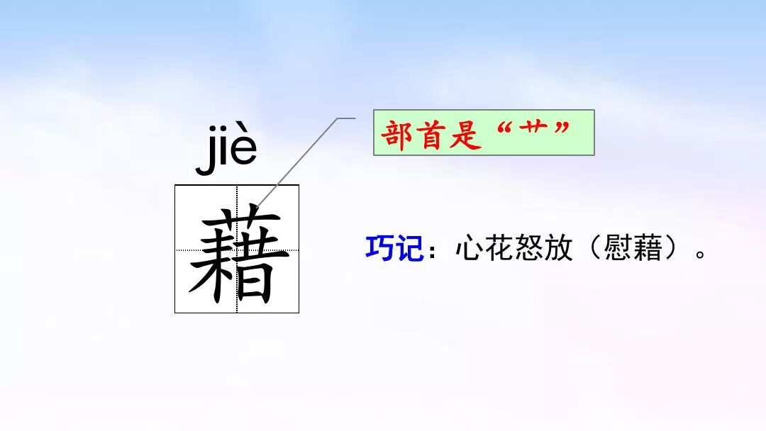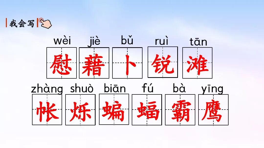 1.认识本课2个生字,认识多音字“卜”,会写“慰、藉、锐”等11个字。理解生字组成的词语。