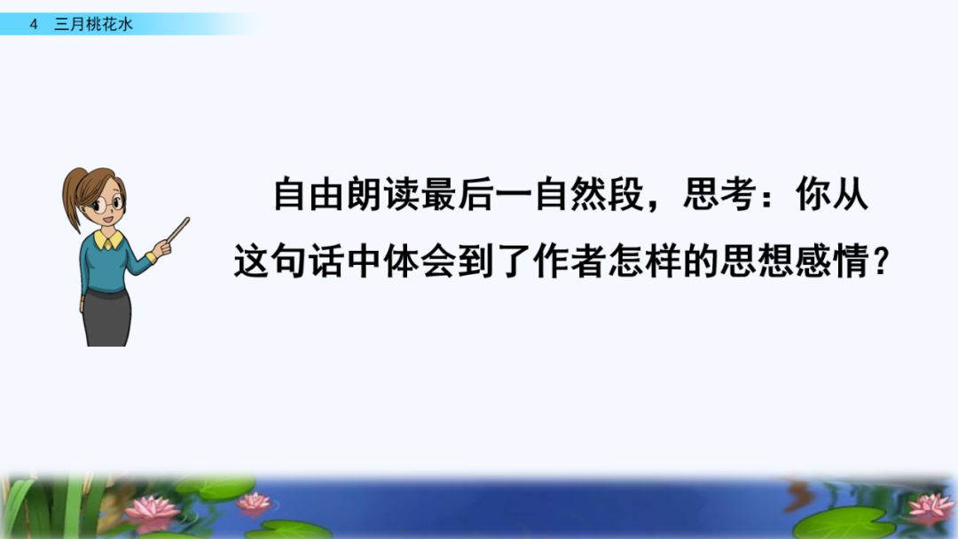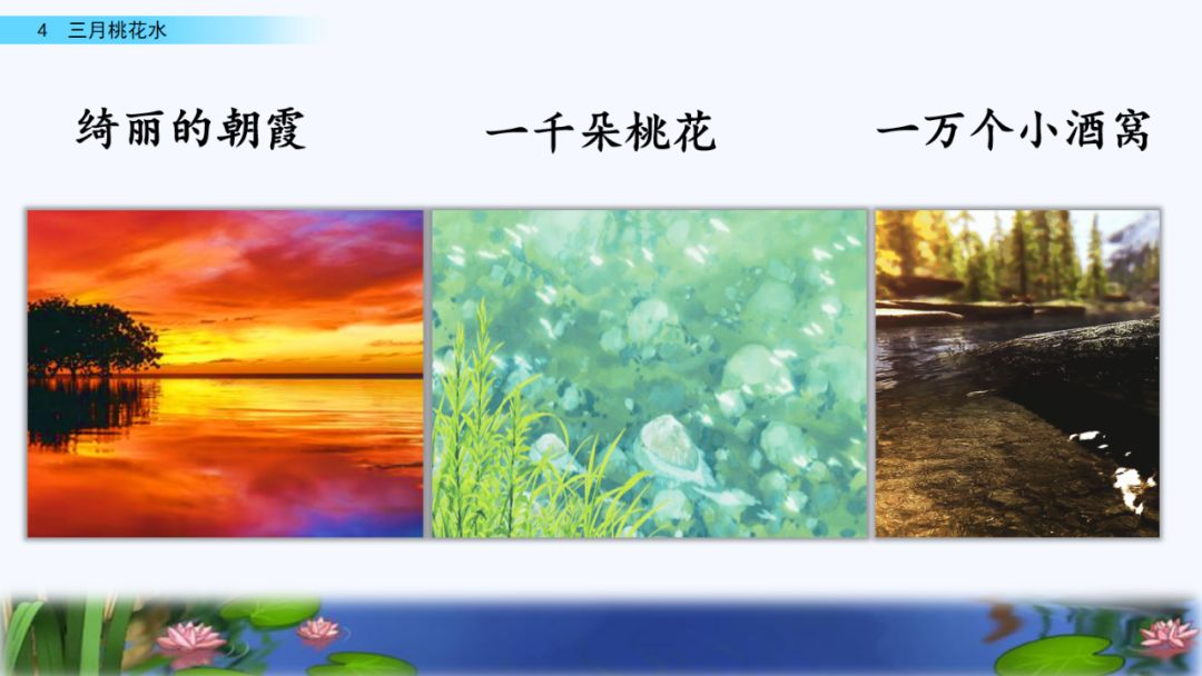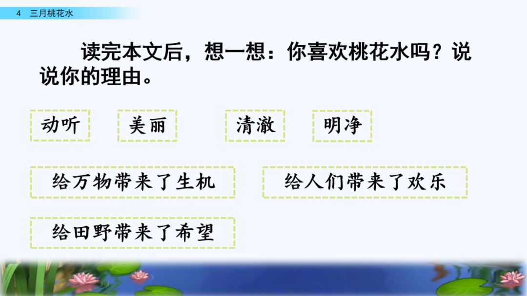 3.感悟全文,请你从三个方面说说桃花水的美。