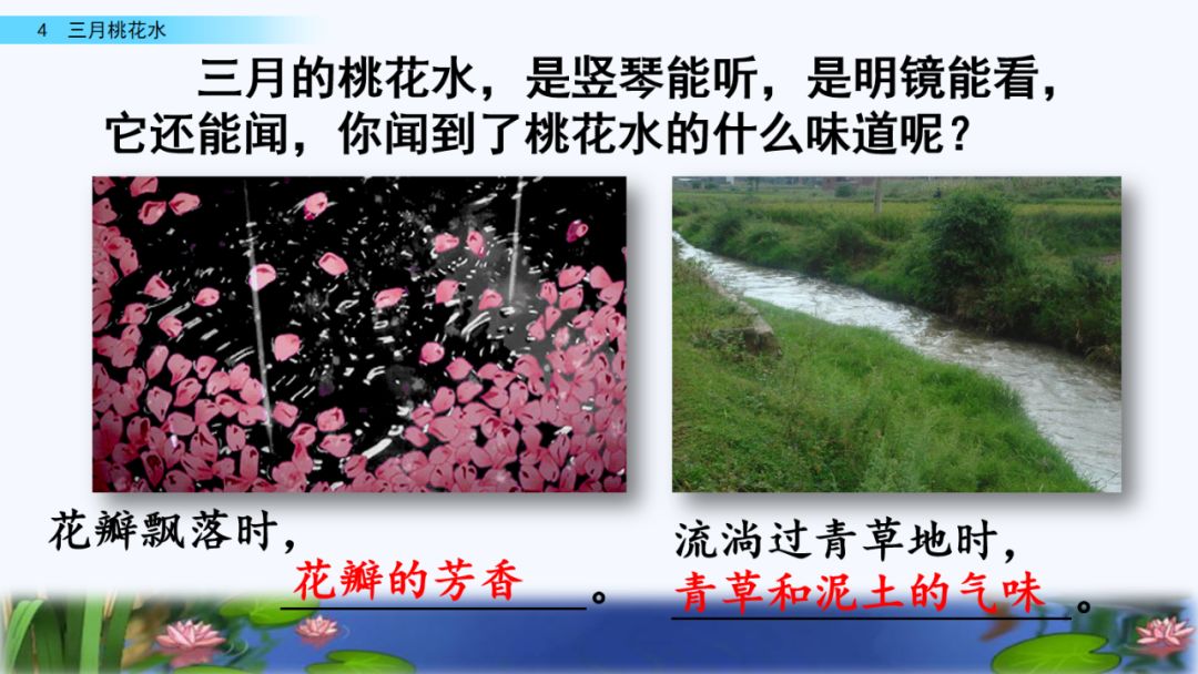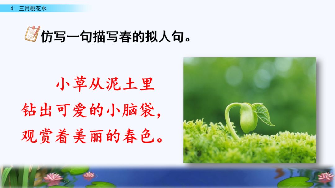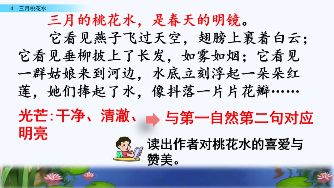 4.“三月的桃花水,是春天的明镜。”说说你聪明镜中看到了哪些景物。