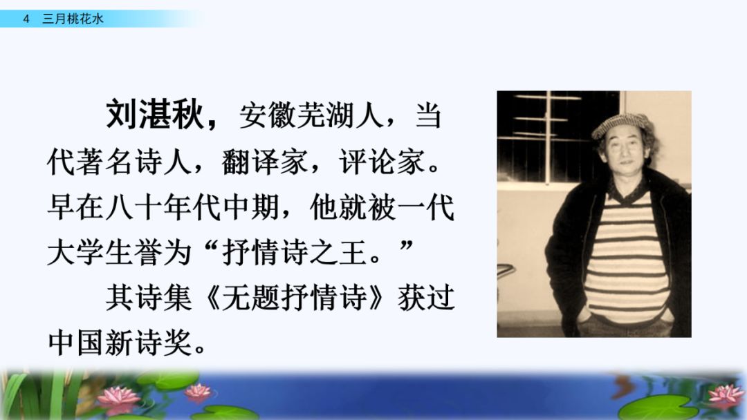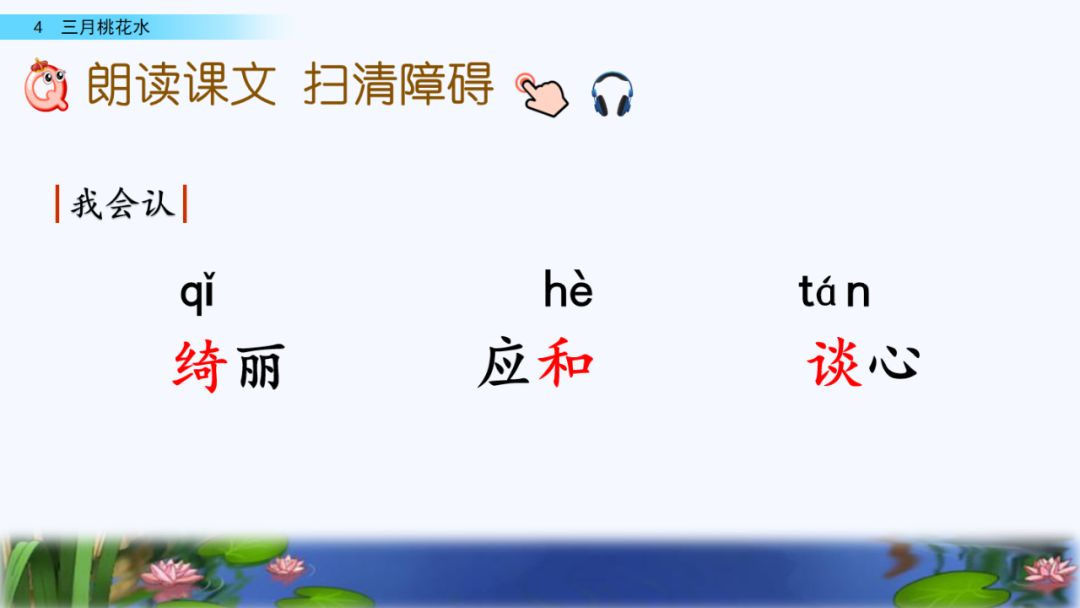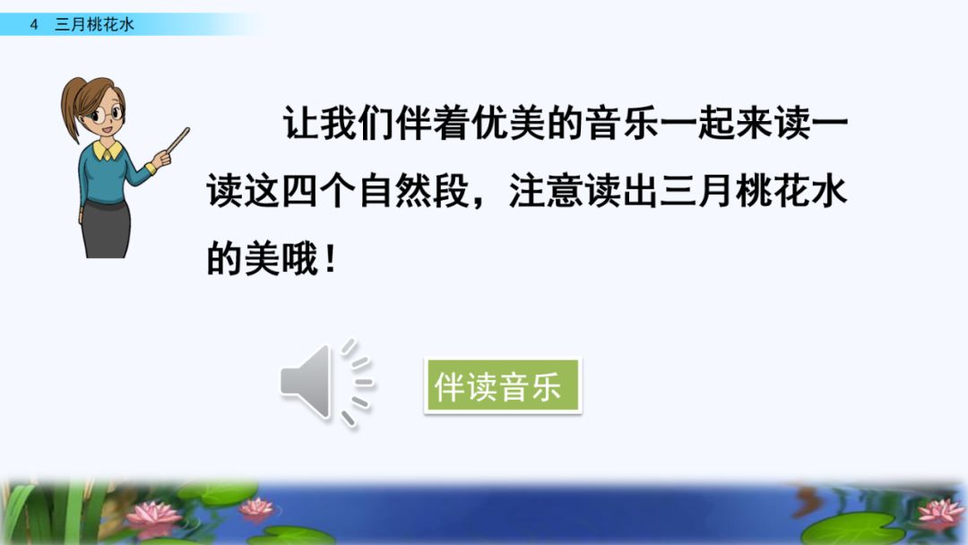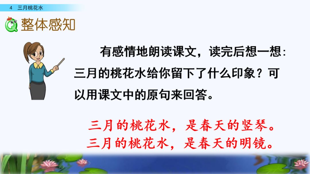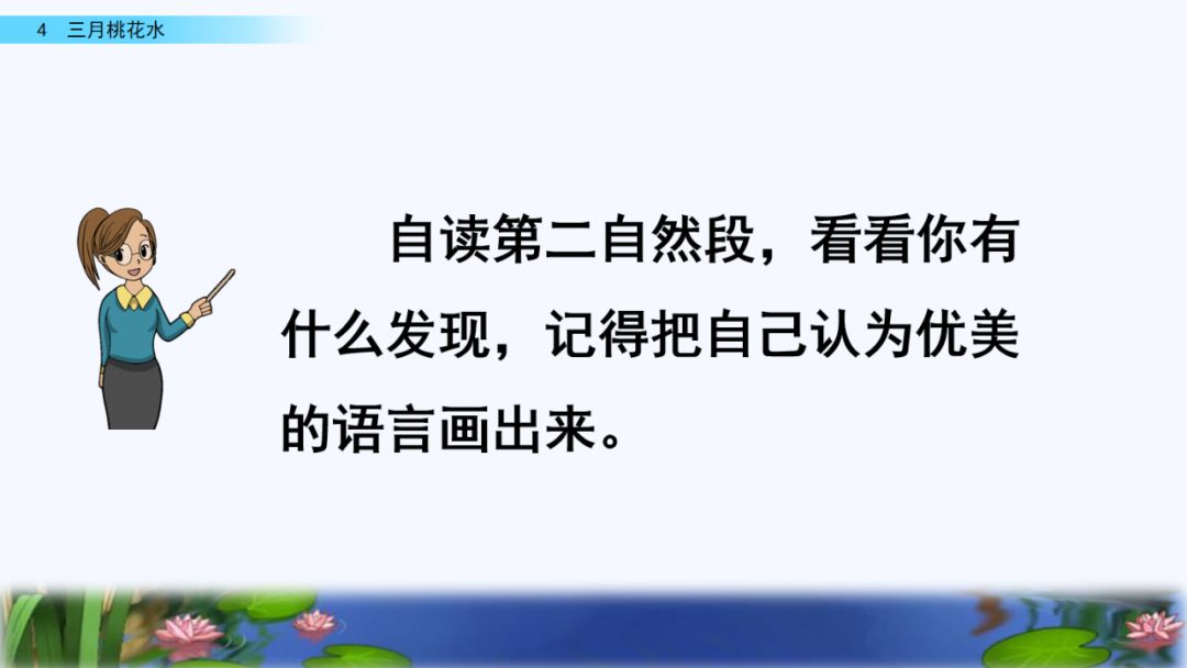 3. 抓住优美的语言,理解课文内容,了解“桃花水”的特点,感受春天的美景和勃勃生机,激起对大自然的热爱之情。