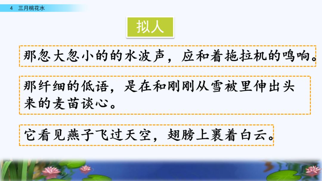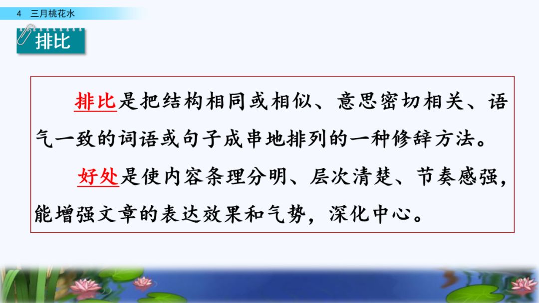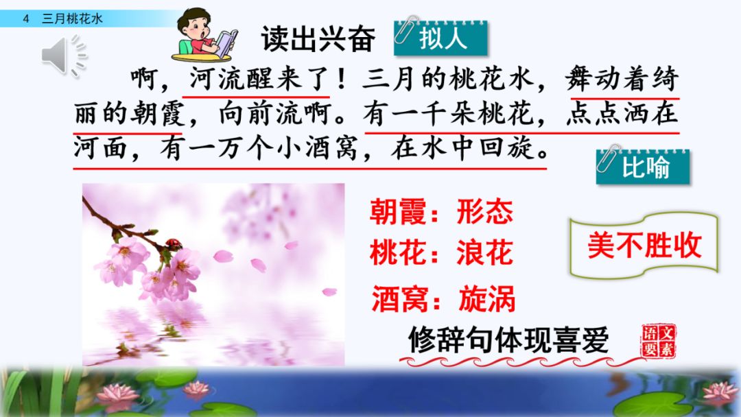 2. 体会语言的优美,读出作者对桃花水的喜爱和赞美之情。学习运用排比、比喻、拟人等修辞手法。