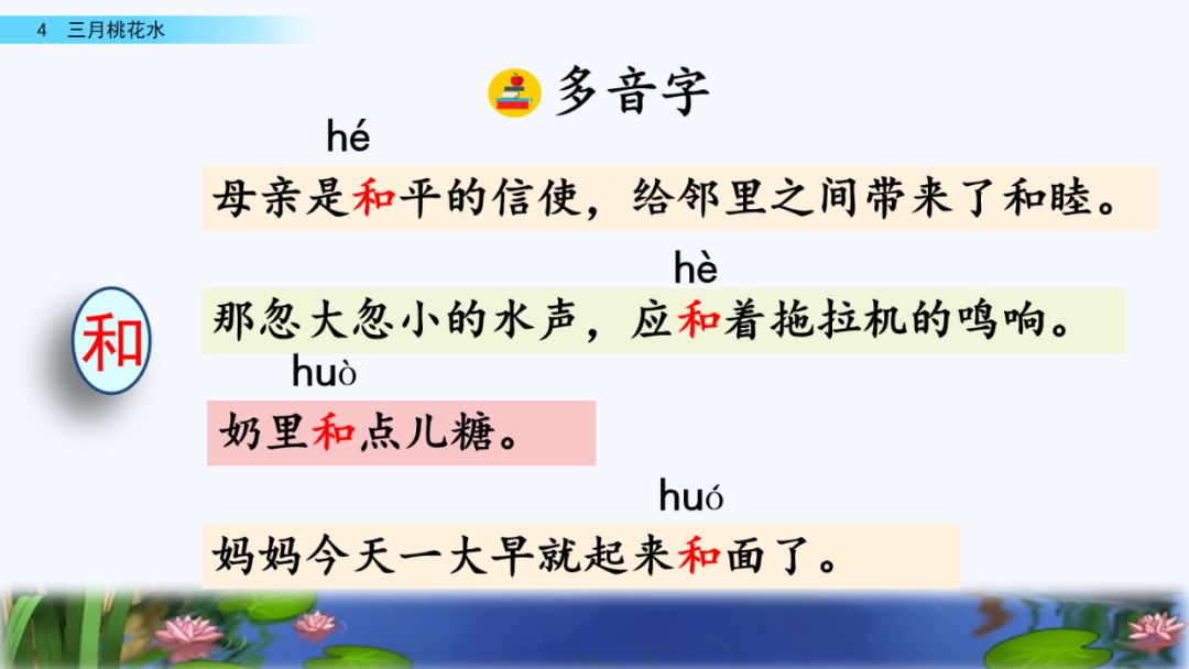和:hé(和和美美)huó(和面)huò(和弄)hè(附和)