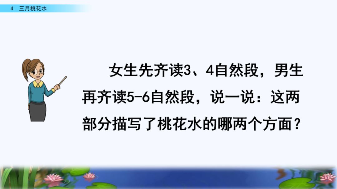 第二段(3-6):描写三月桃花水,展示了其“有声”“有色”的美。