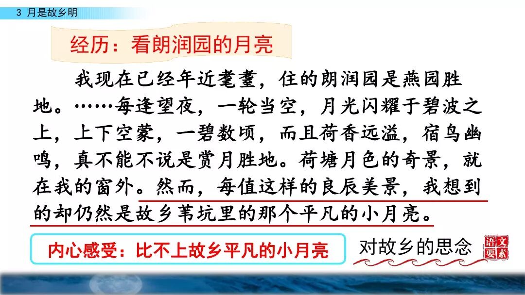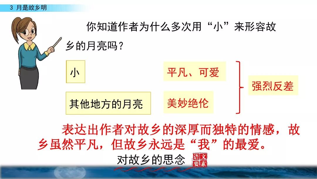 4. 这些童年趣事也是围绕着月亮来写的,捉知了、看月亮、做梦都跟月亮有关,不是多余,反而更能表达出对故乡的思念。