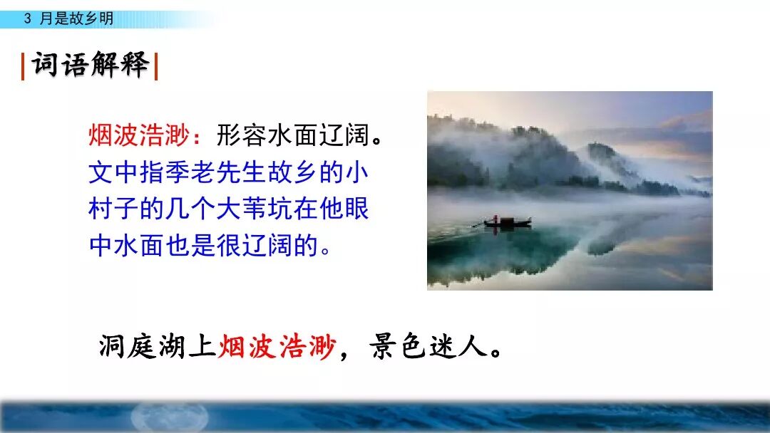 5.烟波浩渺:形容江湖水面十分辽阔。烟波:烟雾笼罩的江湖。浩渺;辽阔无边。