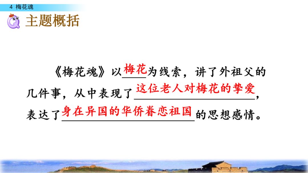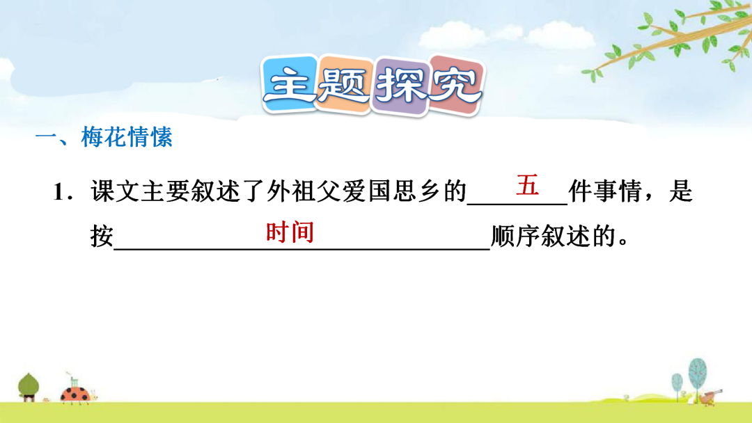 课文写了外祖父吟诗落泪,珍爱梅图,思国伤感,赠墨梅图,送梅花绢等五件事。表达了这位华侨老人对祖国深深的眷恋,对家乡的思念,对祖国的热爱之情。