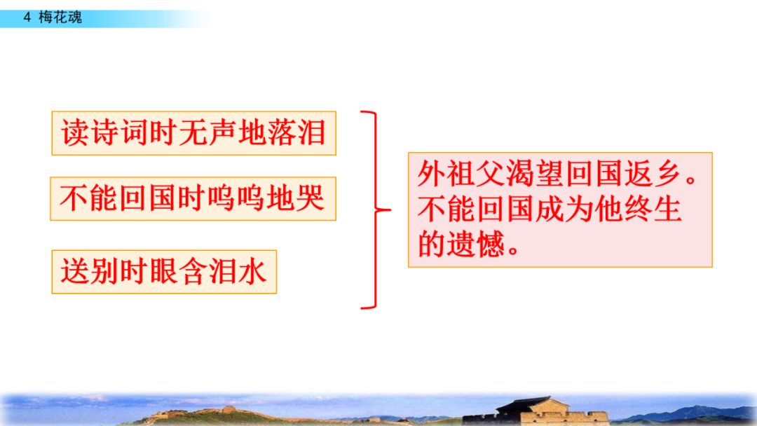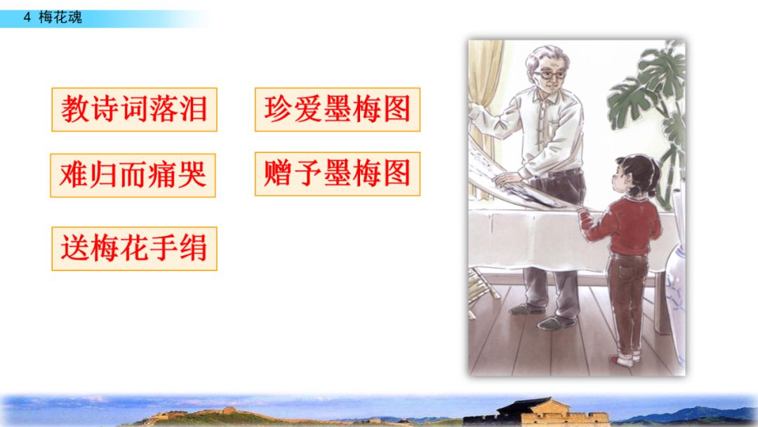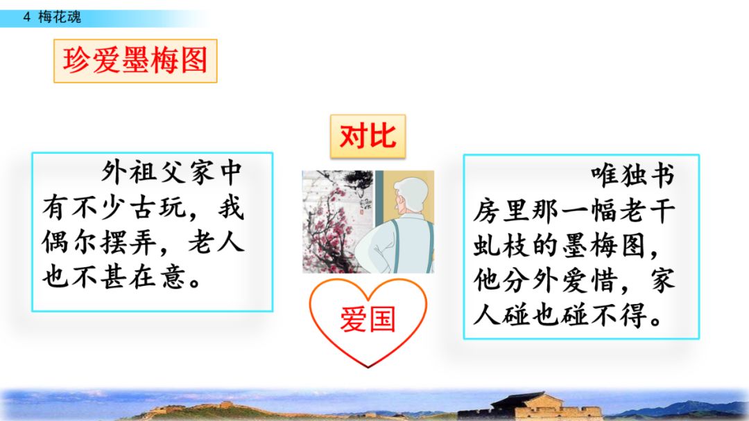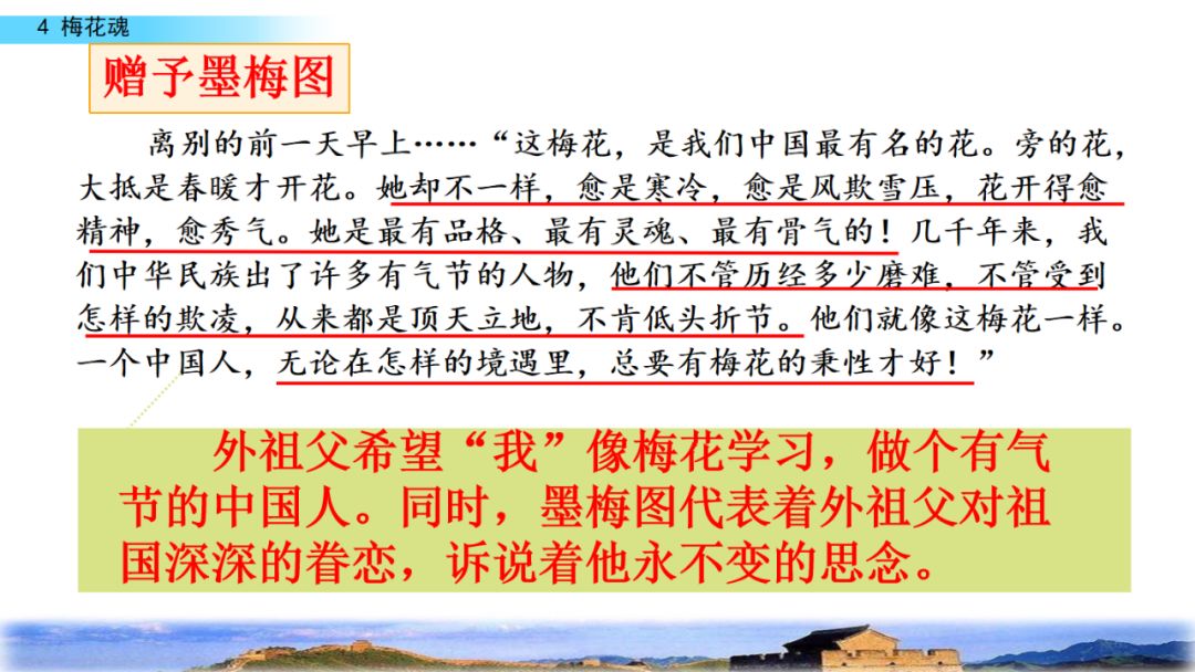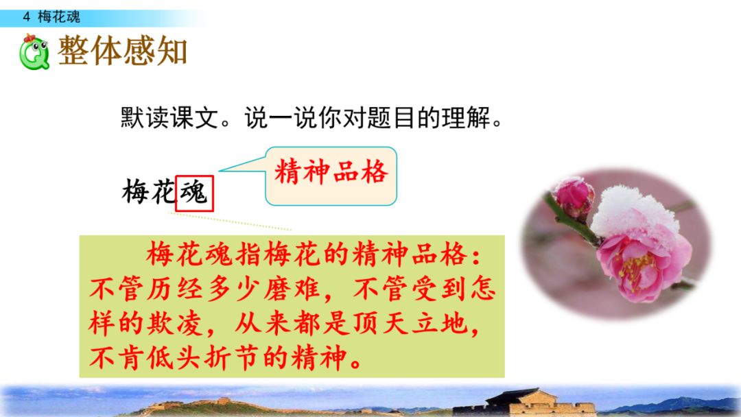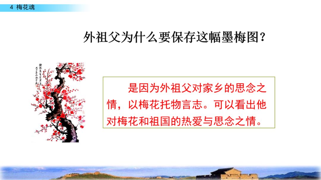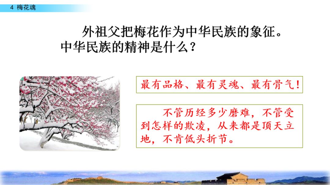 2.默读课文,结合重点词句理解课文内容,领悟梅花不畏风欺雪压的高尚品格,体会外祖父眷恋祖国的感情。