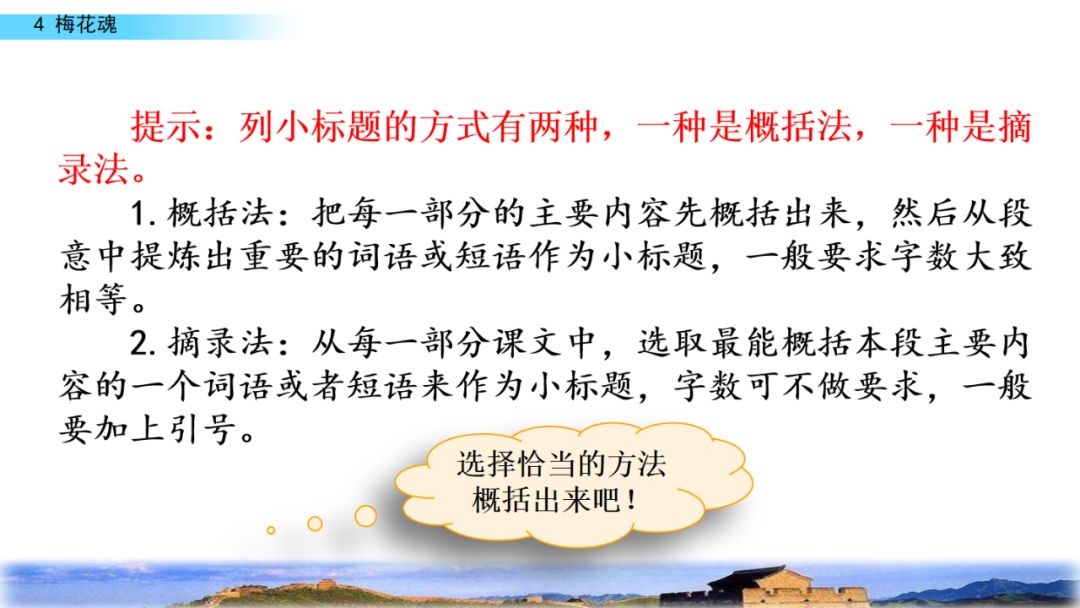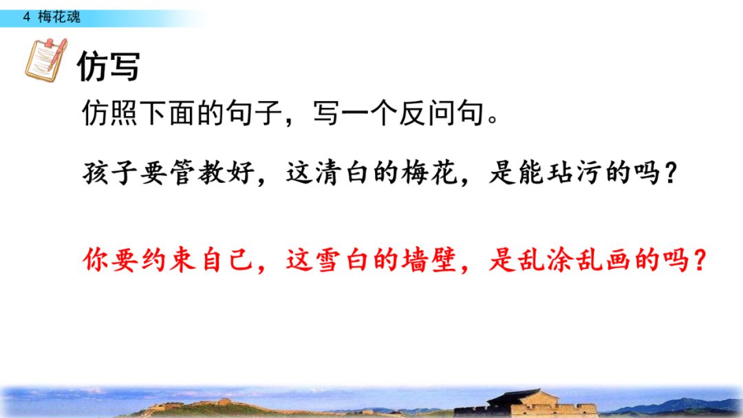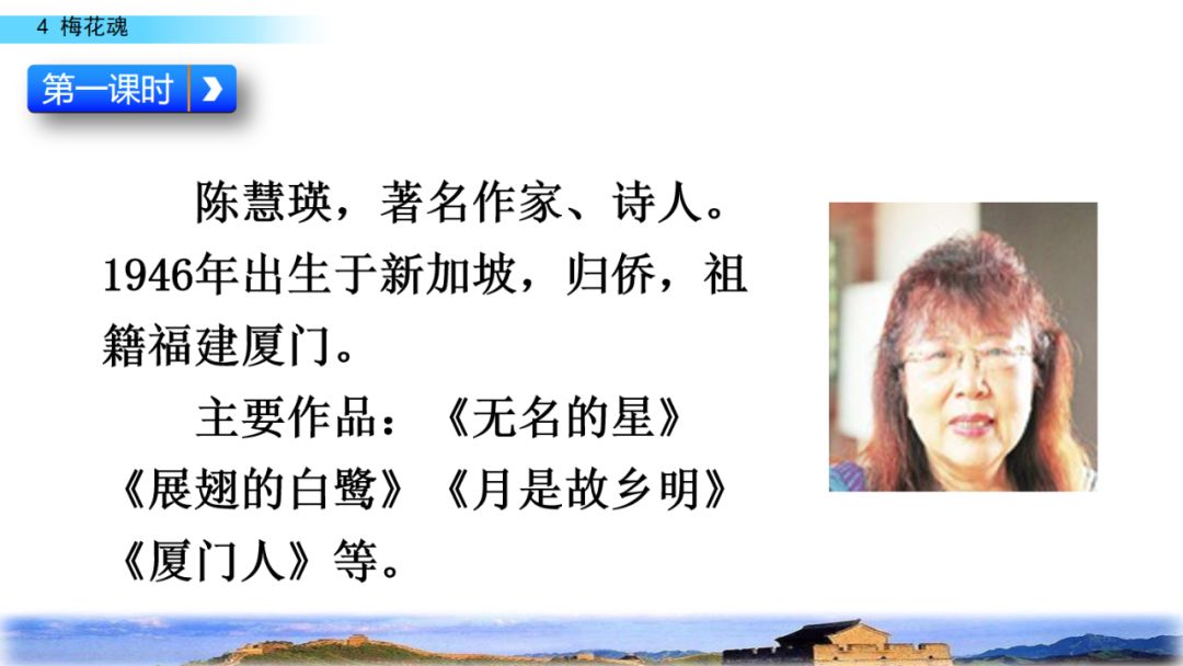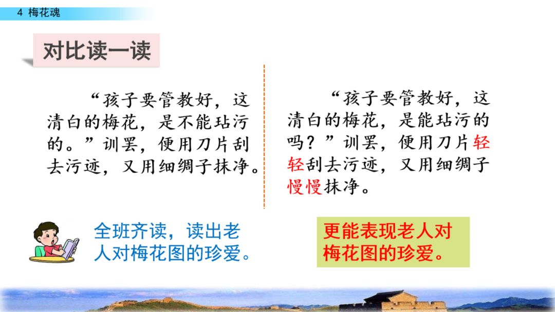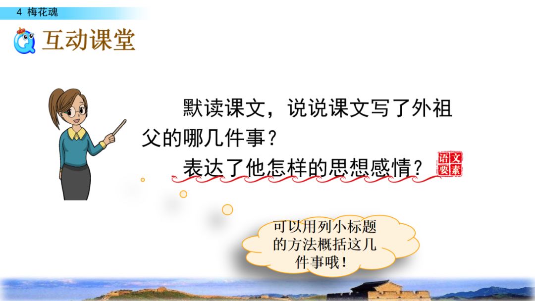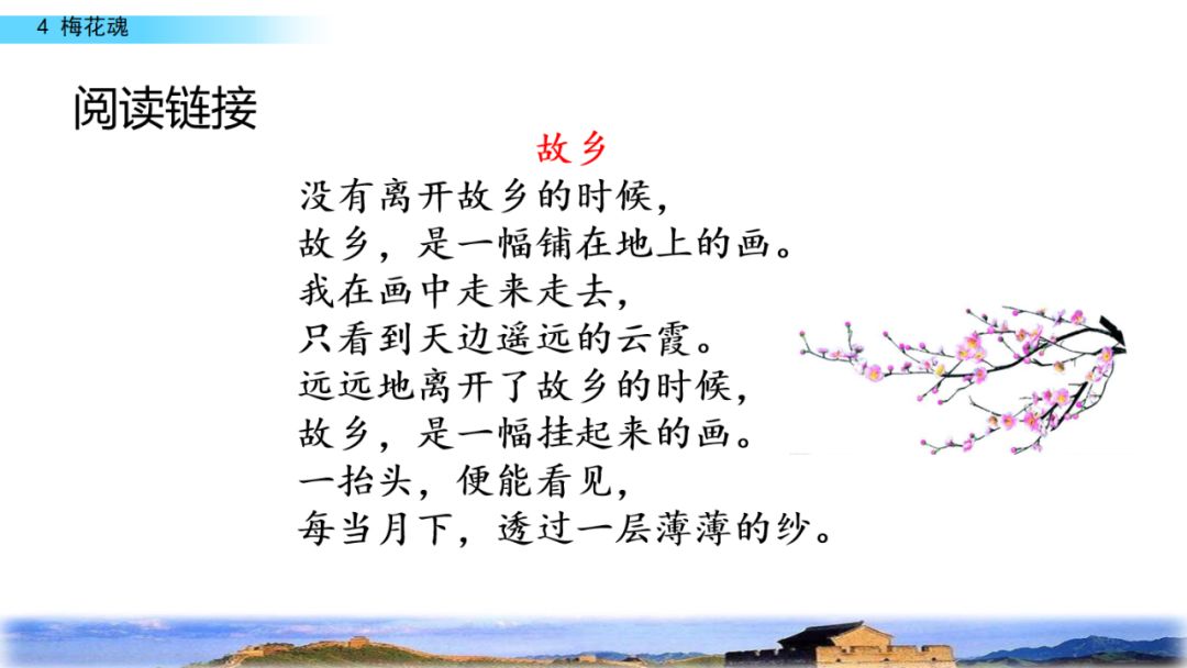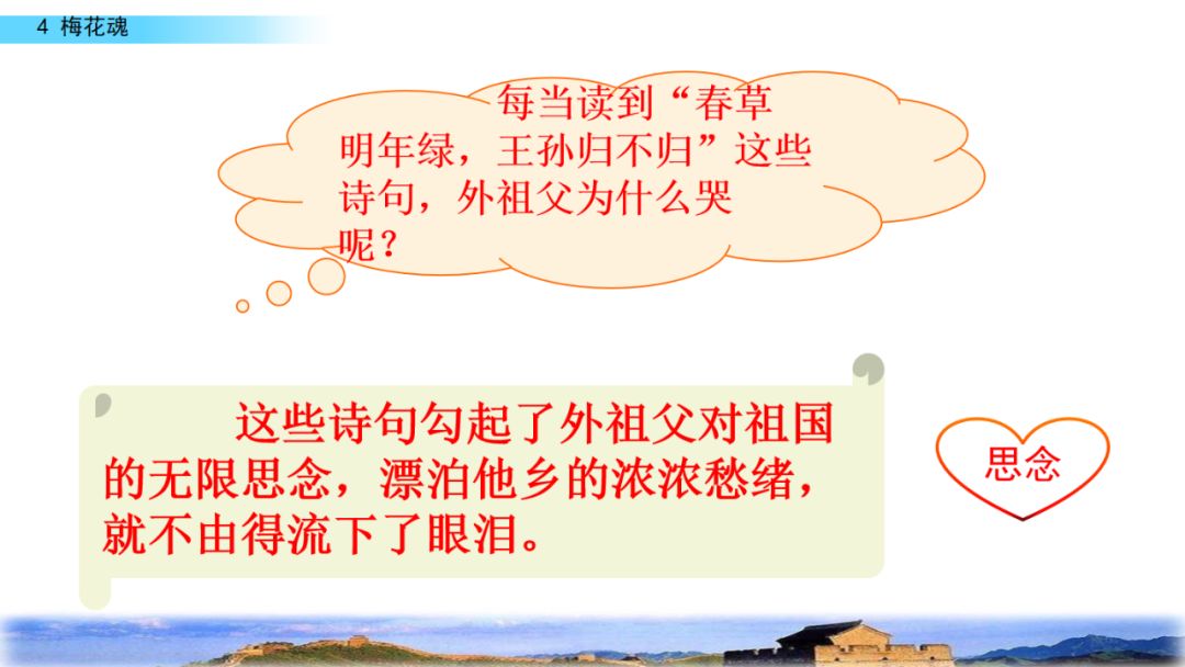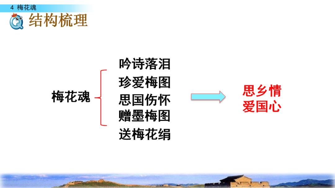 2.默读课文,结合重点词句理解课文内容,领悟梅花不畏风欺雪压的高尚品格,体会外祖父眷恋祖国的感情。